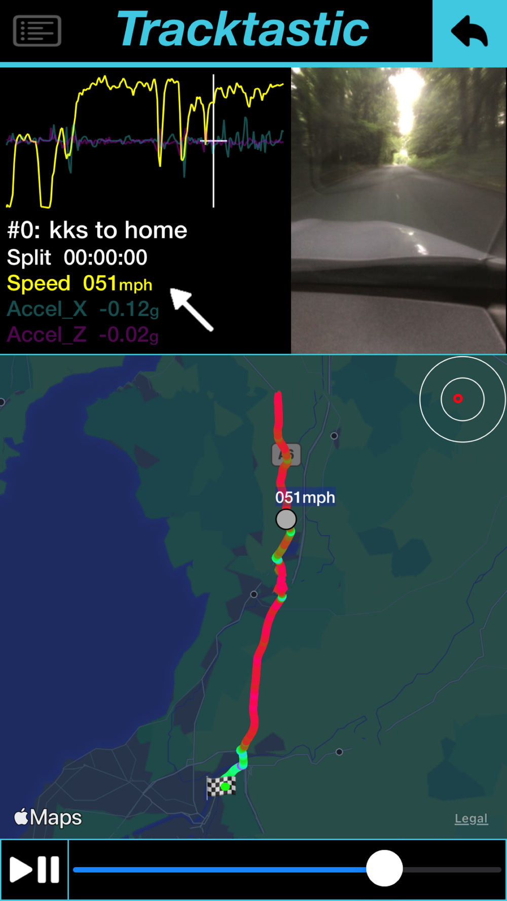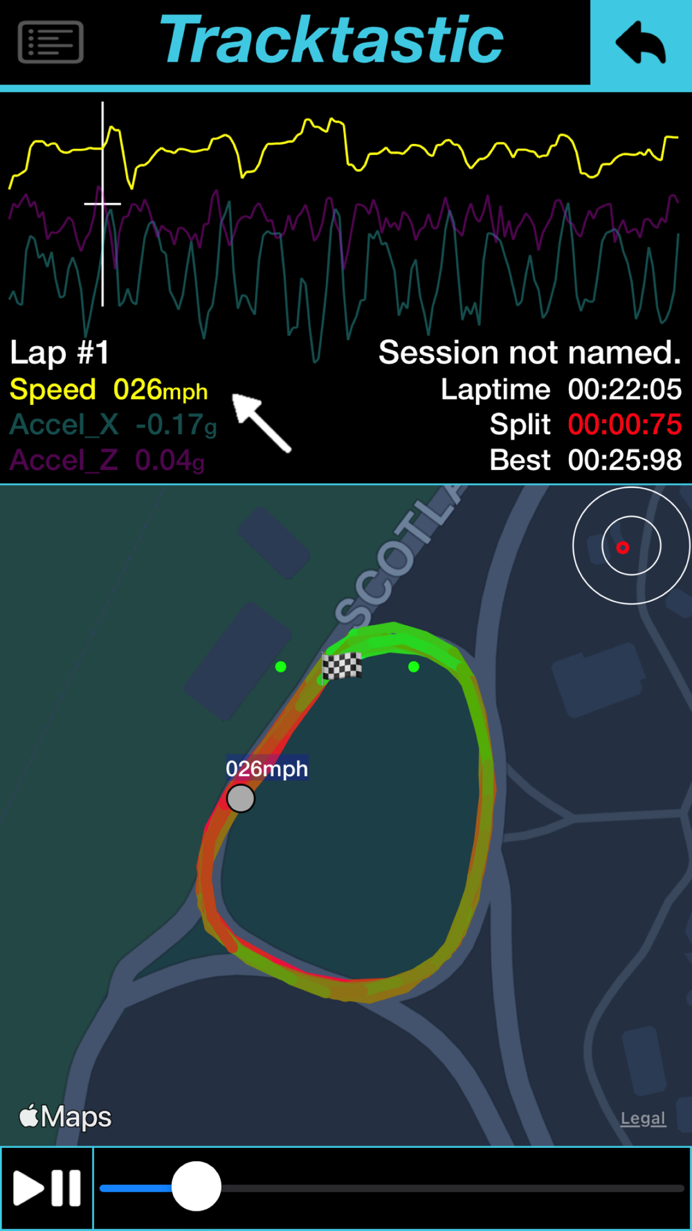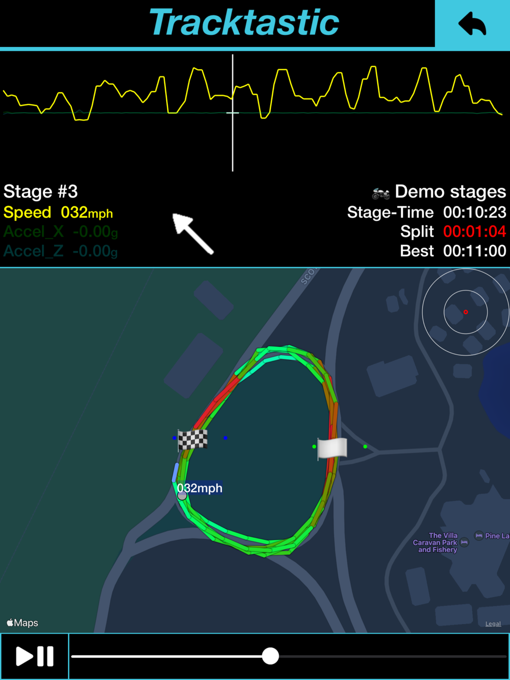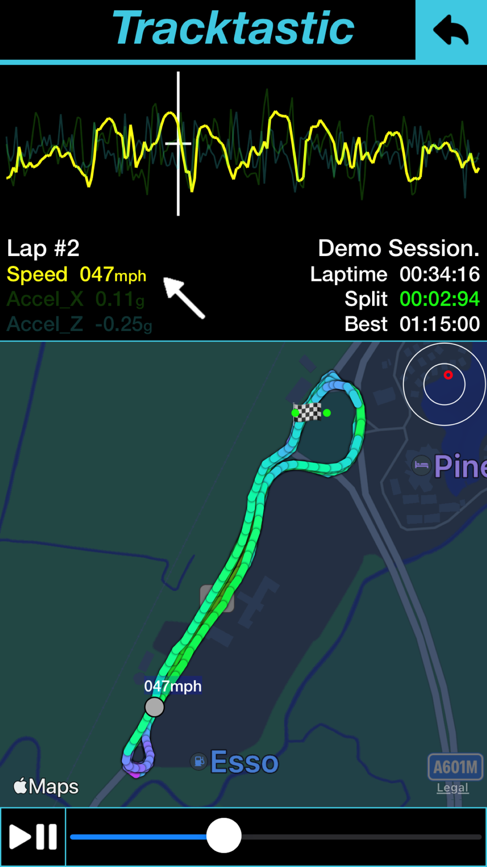 All recorded data from each session can be replayed, with graphical overlays of speed, acceleration, braking and cornering g.