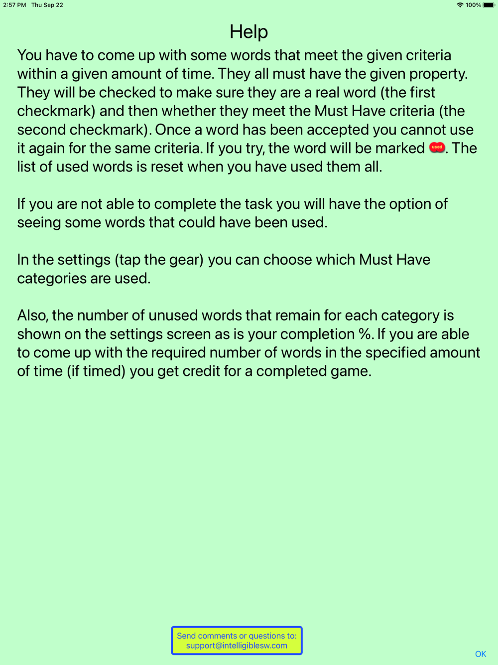 Come up with words that meet the requirements. The more you play, the harder it gets because you can't use the same word more than once in a category. You can decide what the requirements are. It can be timed or not.