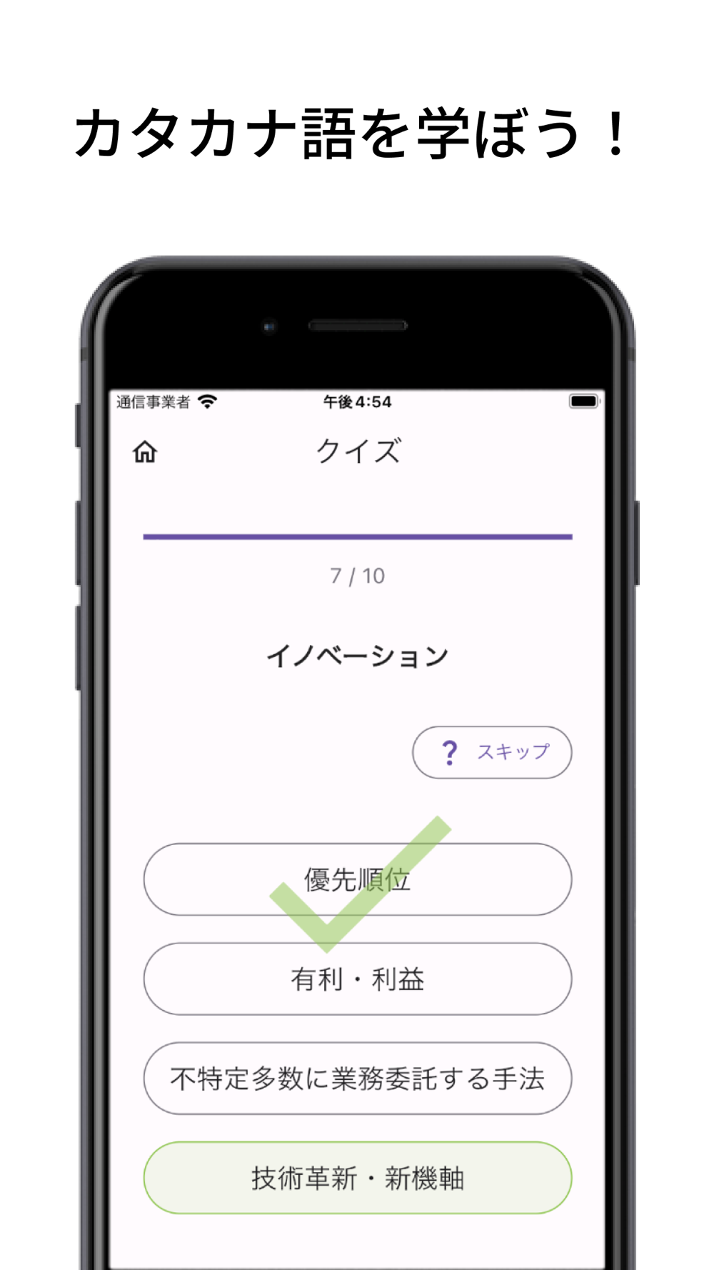 - 2種類のクイズ(カタカナ→意味、意味→カタカナ)