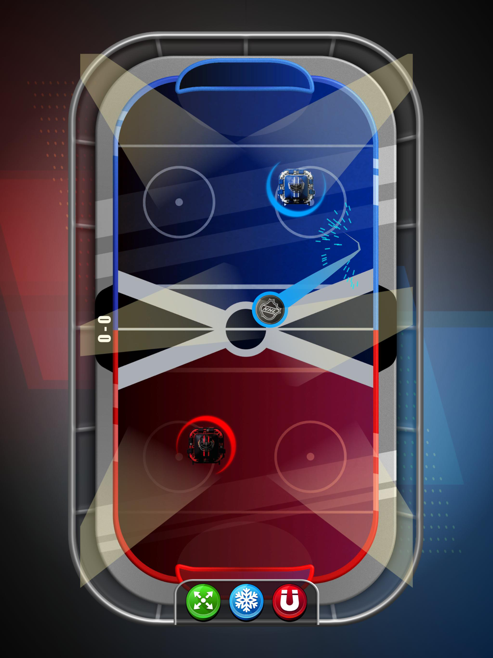 -Boosters: Collect the different boosters (duplicity, invisibility, speed up or mini puck, wall builder and shot on goal) from the ice and use them to get your victory.