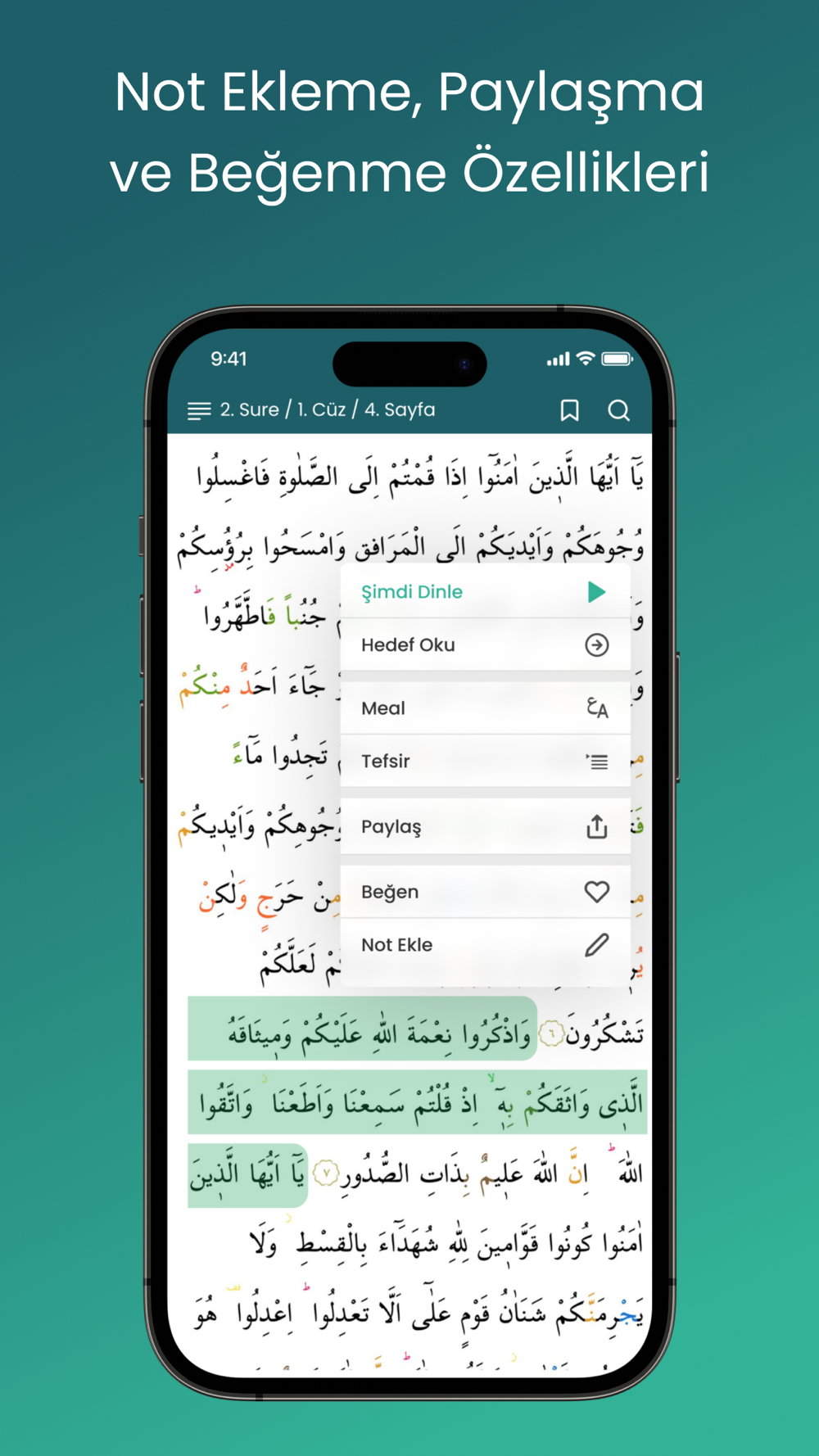 * Sesli okuma esnasında otomatik renklendirme ile okunan Ayeti kolayca takip edebilirsiniz.