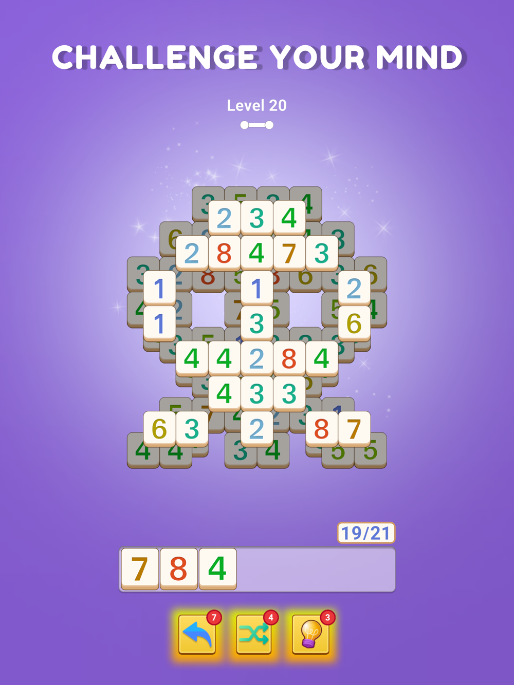 Collect numbers - Challenge your brain through thousands of mahjong puzzles. Puzzles start with low difficulty and become challenging fast!