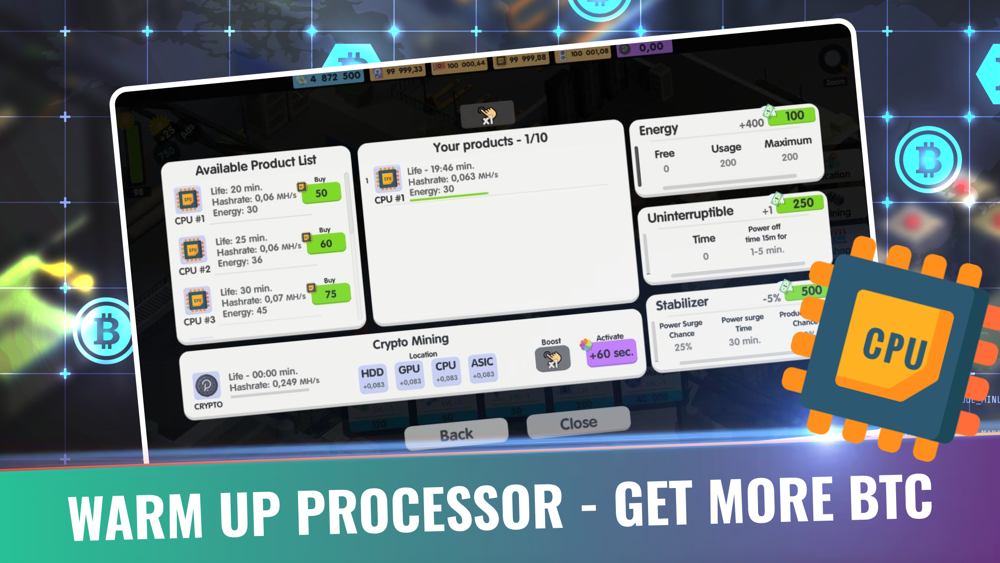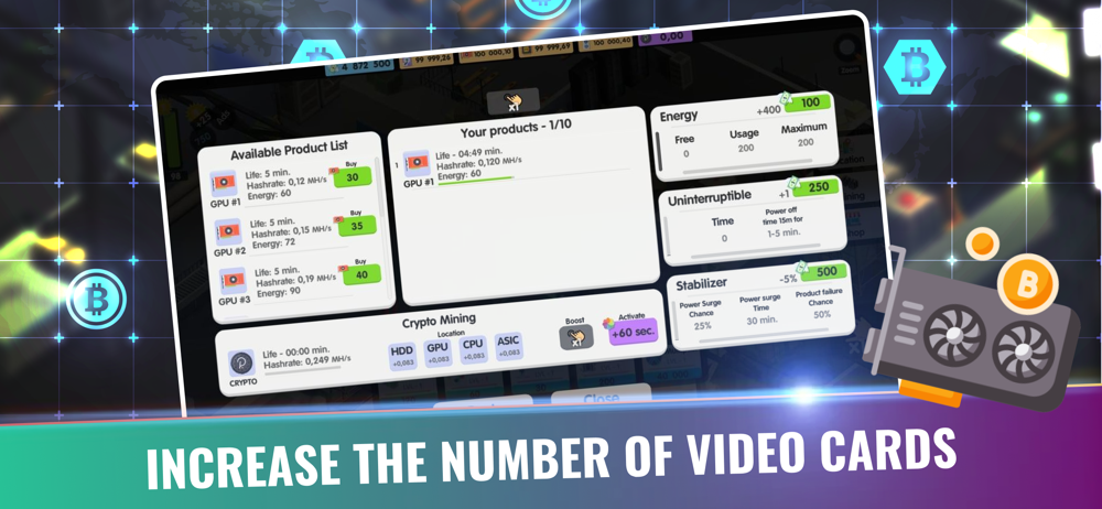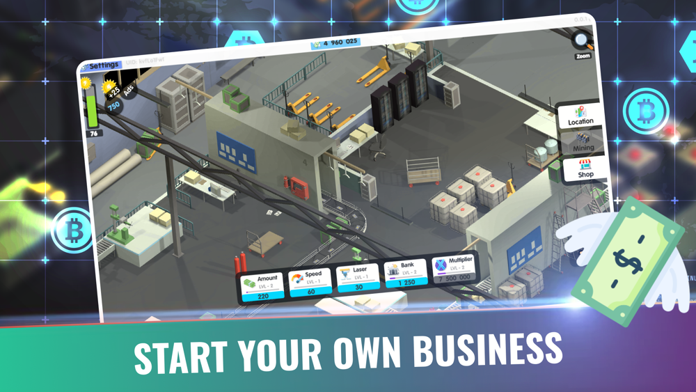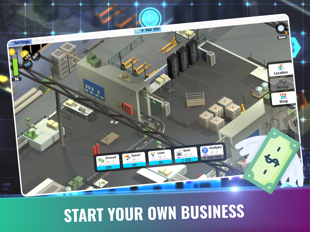Hire and upgrade factory parts to speed up your process, earn idle cash, upgrade your rigs and mine in this simulation video game! Click and tap, then tap some more and start your BTC adventure!