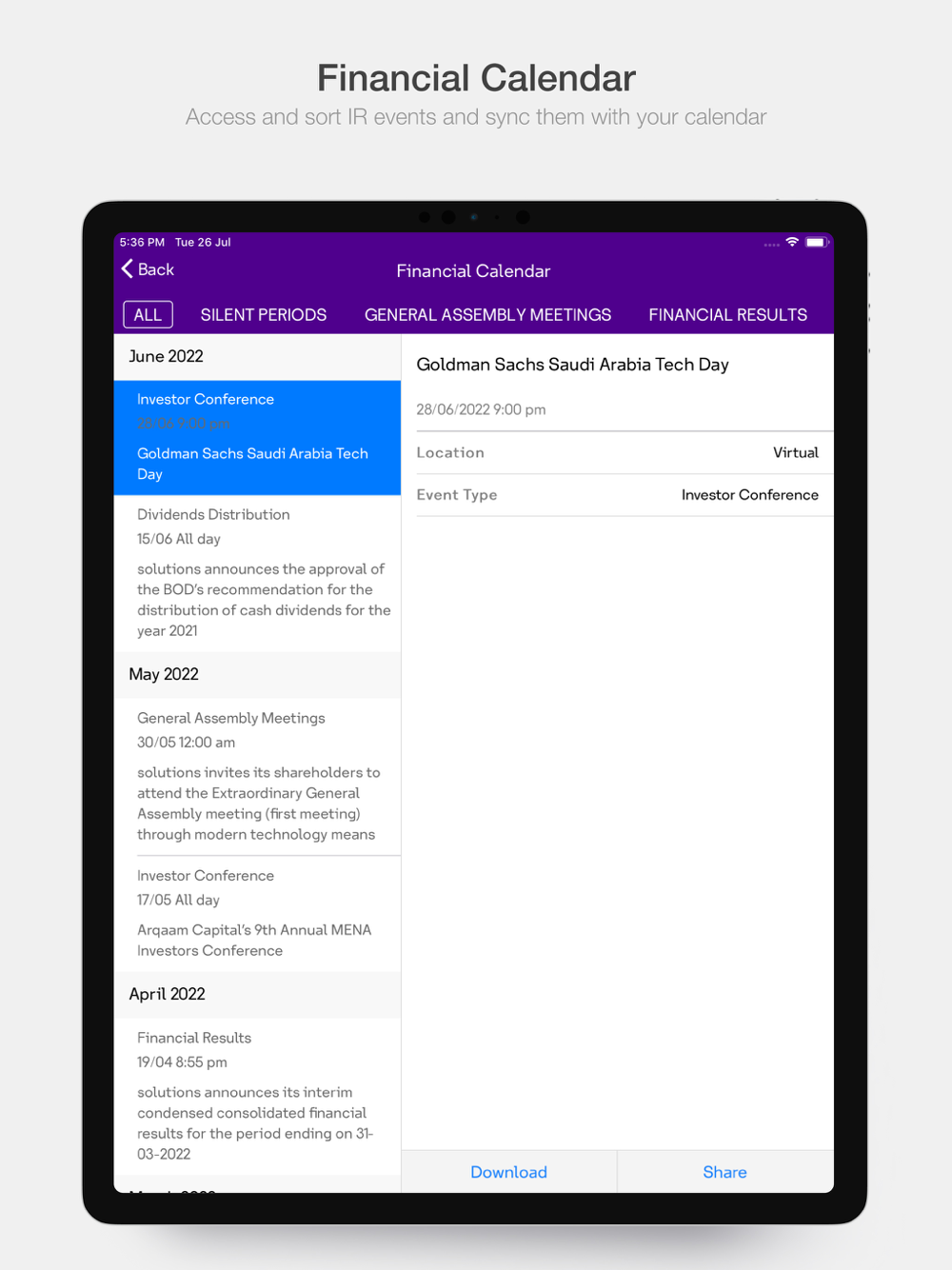 The solutions Investor Relations app will keep you up-to-date with the latest share price data, stock exchange and press releases, IR calendar events and much more.