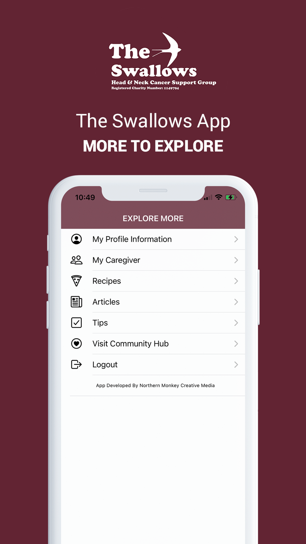 The Swallows Head and Neck Cancer Charity have invested in a unique mobile app that will enable cancer patients to track their journey and symptoms of their illness. Vital information will be shared with your own invited caregiver to help track your status. Not only that, your account will be linked to your local health facility where medical staff can also monitor your vital statistics and take action should it be needed. The Swallows Head and Neck Cancer app is innovative and unique allowing your support network to know exactly how you are feeling and when throughout your cancer journey.