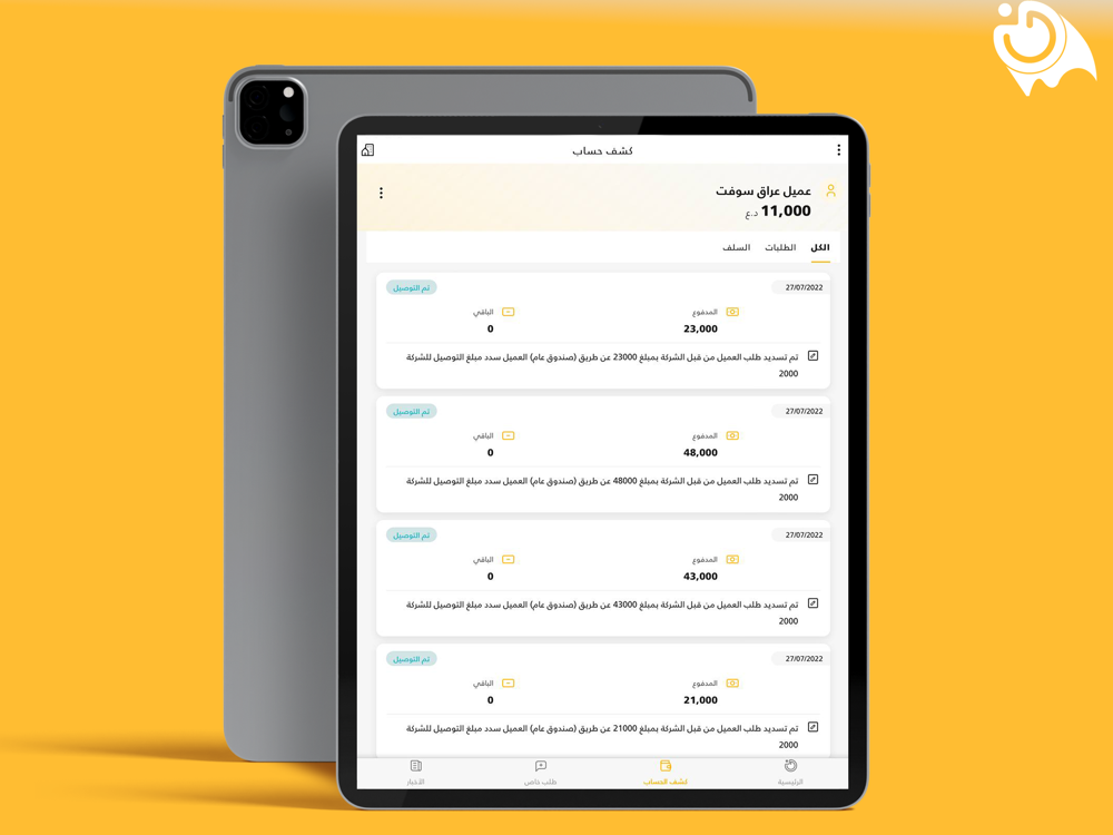 تطبيق خاص لأدارة طلبات التوصيل الخاصة بشركات الشحن يمكن استخدام النظام مع النظام المحاسبي المتكامل تبليغات واضافة ملاحظات على الطلبات والتحكم من قبل السائق والعميل وكشف حساب للتداولات المالية مع امكانية ارسال اخبار الى العملاء او السواق بالاضافة الى خصائص متعددة للنظام