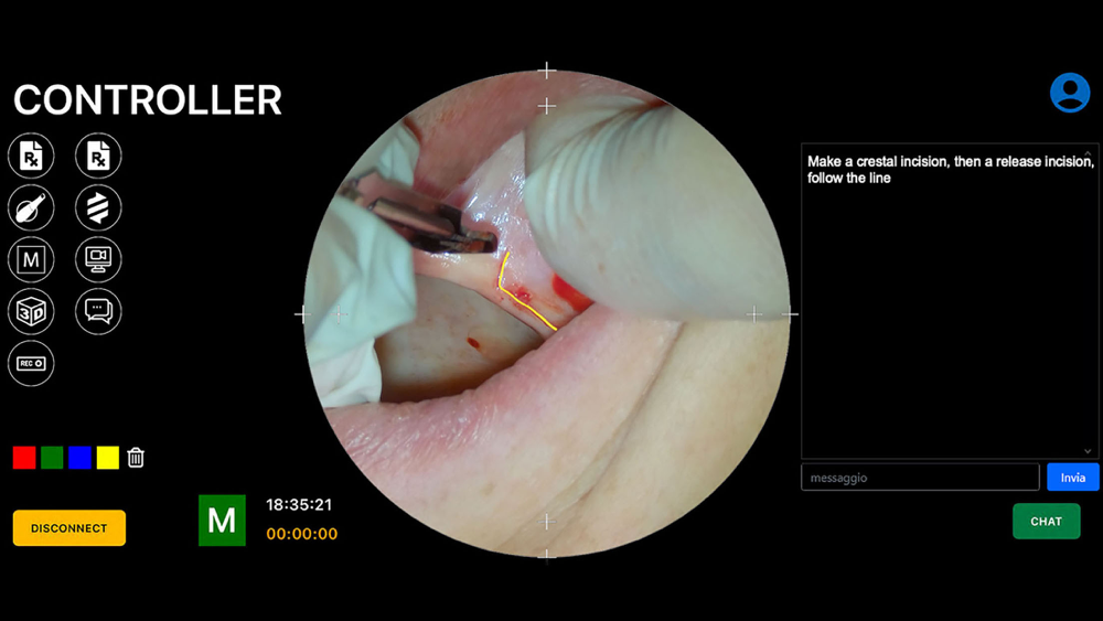 The live stream option allows the viewer to see the live images from the surgical field including any additional imaging viewed by the operator (X-rays, CT, or even another camera in the operating room to check what another surgeon is doing). Through special icons there is also the possibility to draw and point at something on the surgical area. This will be seen by the surgeon carrying out the operation and can be implemented by some indications through the chat option. The surgeon can, at any time, remove these elements from his view.
