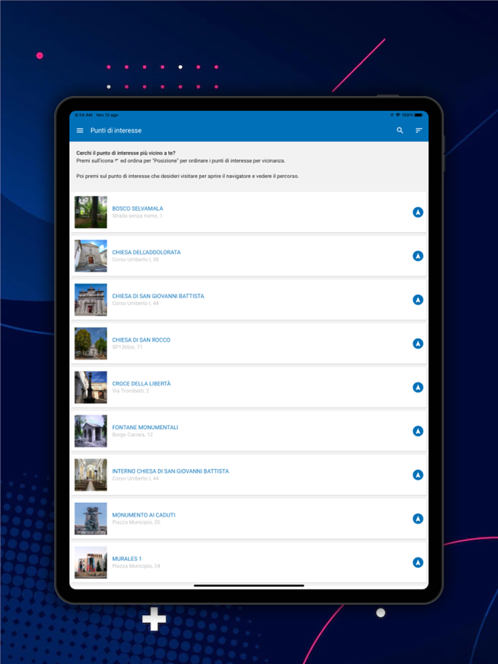 Abbiamo aggiunto la lista dei punti di interesse sia in modalità lista che mappa. Scopri il punto di interesse più vicino a te; puoi impostarlo direttamente nel tuo navigatore per raggiungerlo e scoprine i segreti.