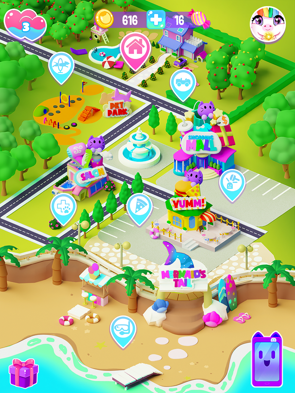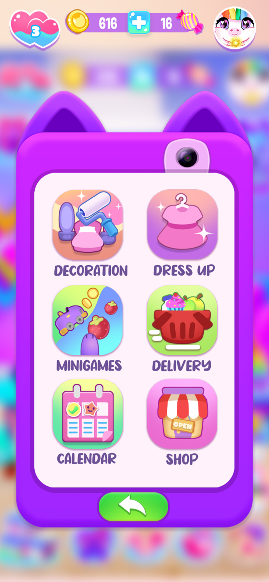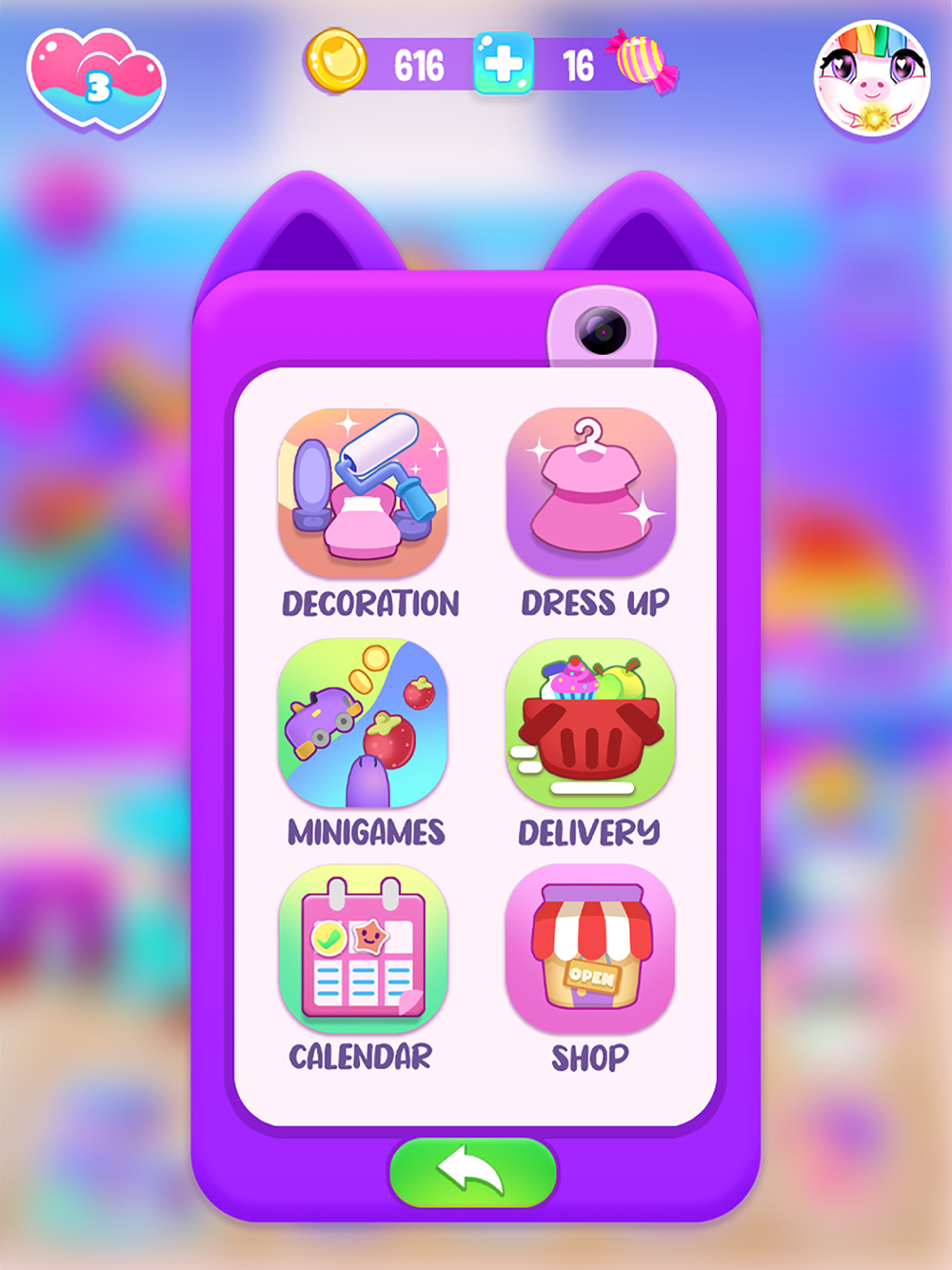 You can decorate Violet’s house as you wish by tapping on the “decoration” icon. Try out different bedframes or wallpapers, the choice is yours. You can also buy new pieces of clothing, check out all of these outfits from the store. In order to buy items, you need to spend coins and candy. That is why we created a lot of fun mini-games for you to earn money easily. For instance, one of them requires you to choose a car from our wide selection. After you have made up your mind drive it past the finish line to level up. Along the way try to collect as many coins as you possibly can. The pizza mini-game is quite simple: take your client’s order and make sure to catch all the right ingredients to be put on the dough. Avoid bombs at all costs and get a perfect match by grabbing all the items that were needed. It is time to color some drawings. Pick out the design that you want and start filling in the lines. On the right side of the screen, you will find tools like crayons, pencils, paint, stencils and so much more. Do not forget to save your drawing! Another great available feature is daily tasks. They will be given to you and if they will be completed you will be rewarded with candy. Next, take Violet’s pet to the salon. Wash off all the dirt and mud by using shampoo, brush her fur. Don’t forget to check up on Violet and her little pet every day for daily rewards!