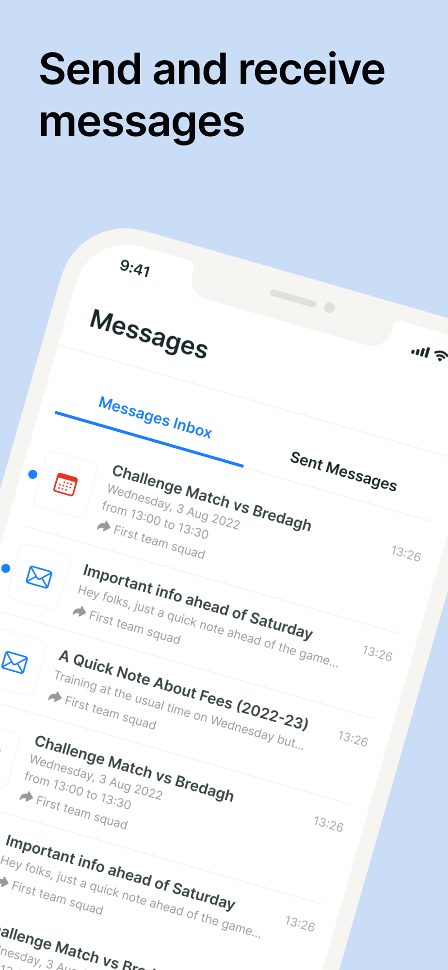 • Automatically notify parents of children on your teams when training or matches are scheduled