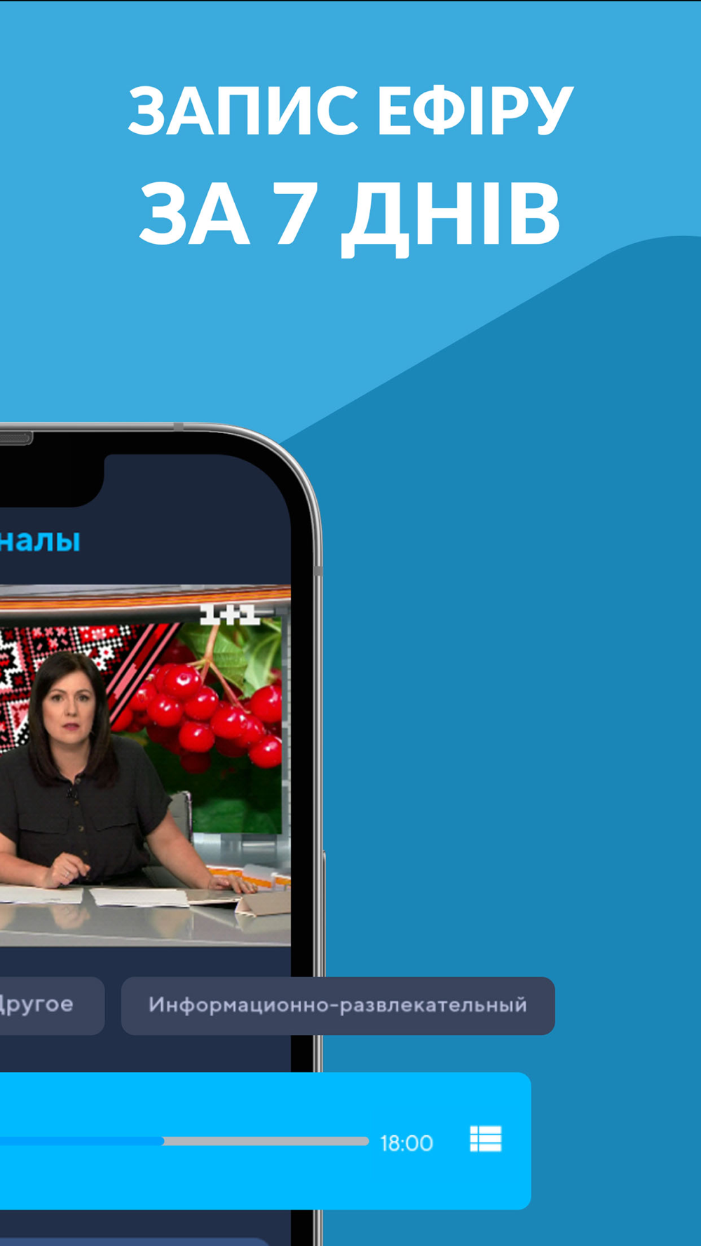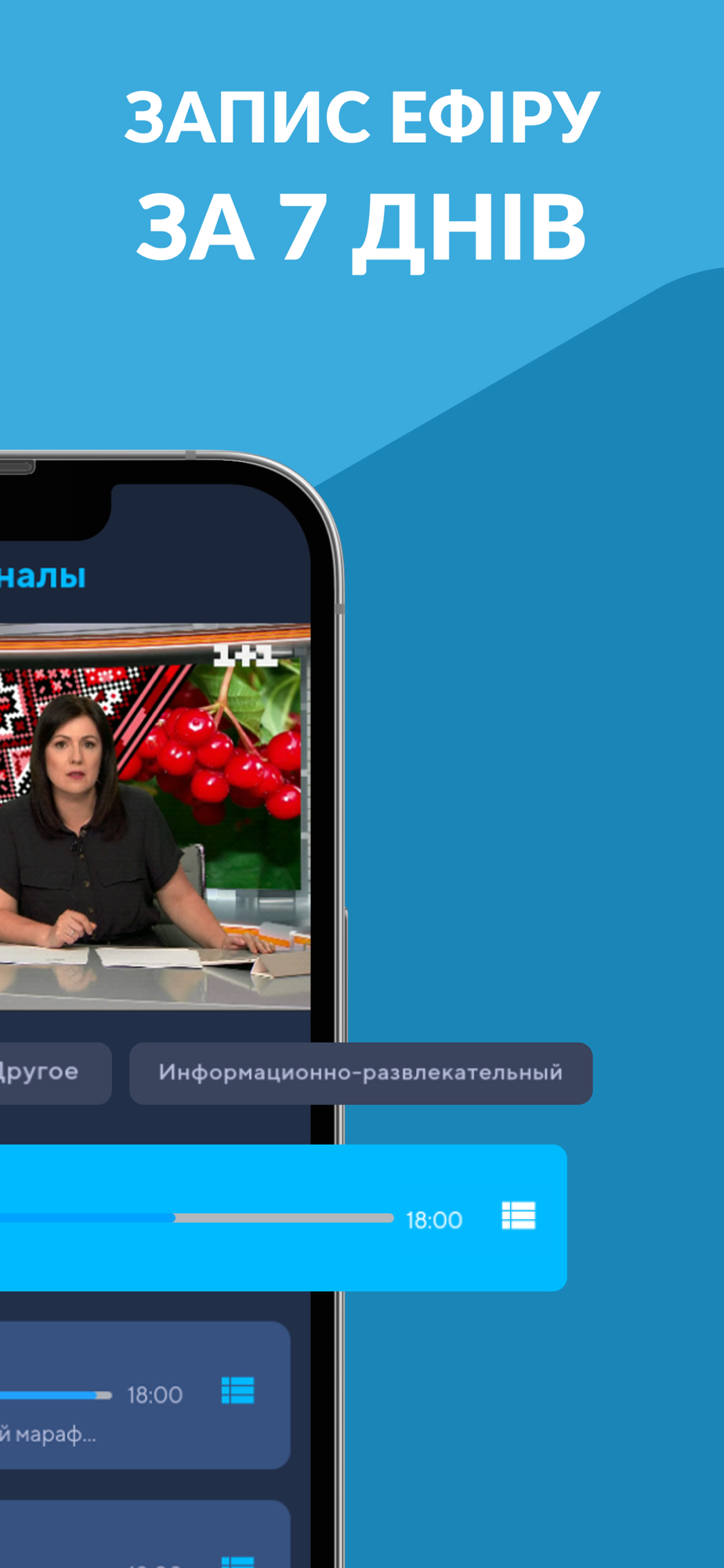 Керуйте переглядом — ставте ефір на паузу та вмикайте його пізніше. Є смуга прокручування для перемотки та перегляду з початку. Дивіться улюблені передачі у свій зручний час, не прив'язуючись до телепрограми. Запис ефіру зберігається 7 днів.