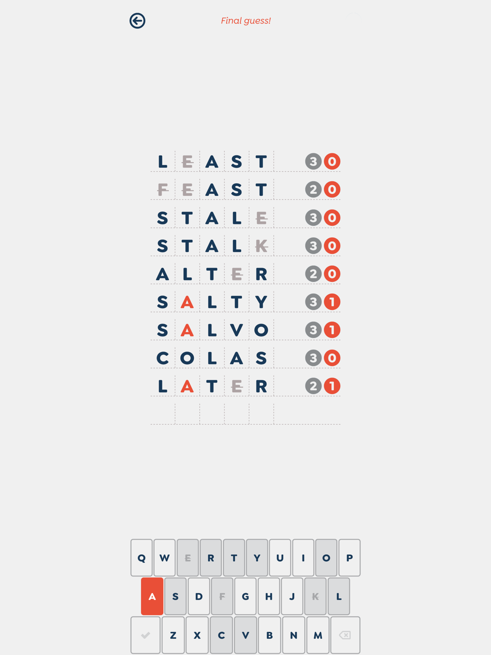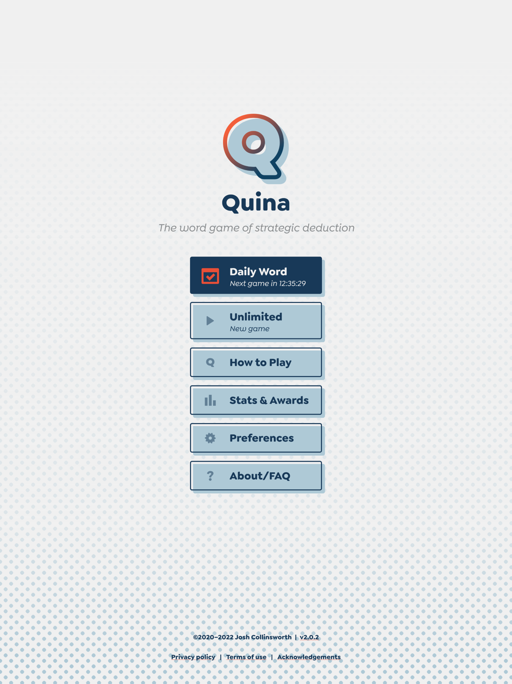 Quina tracks your game history and statistics on your device, and offers 25 in-game awards available to unlock for bragging rights and extra challenge! A variety of gameplay settings are available to tweak the difficulty, including a choice of multiple word sets, and two kinds of optional hints.