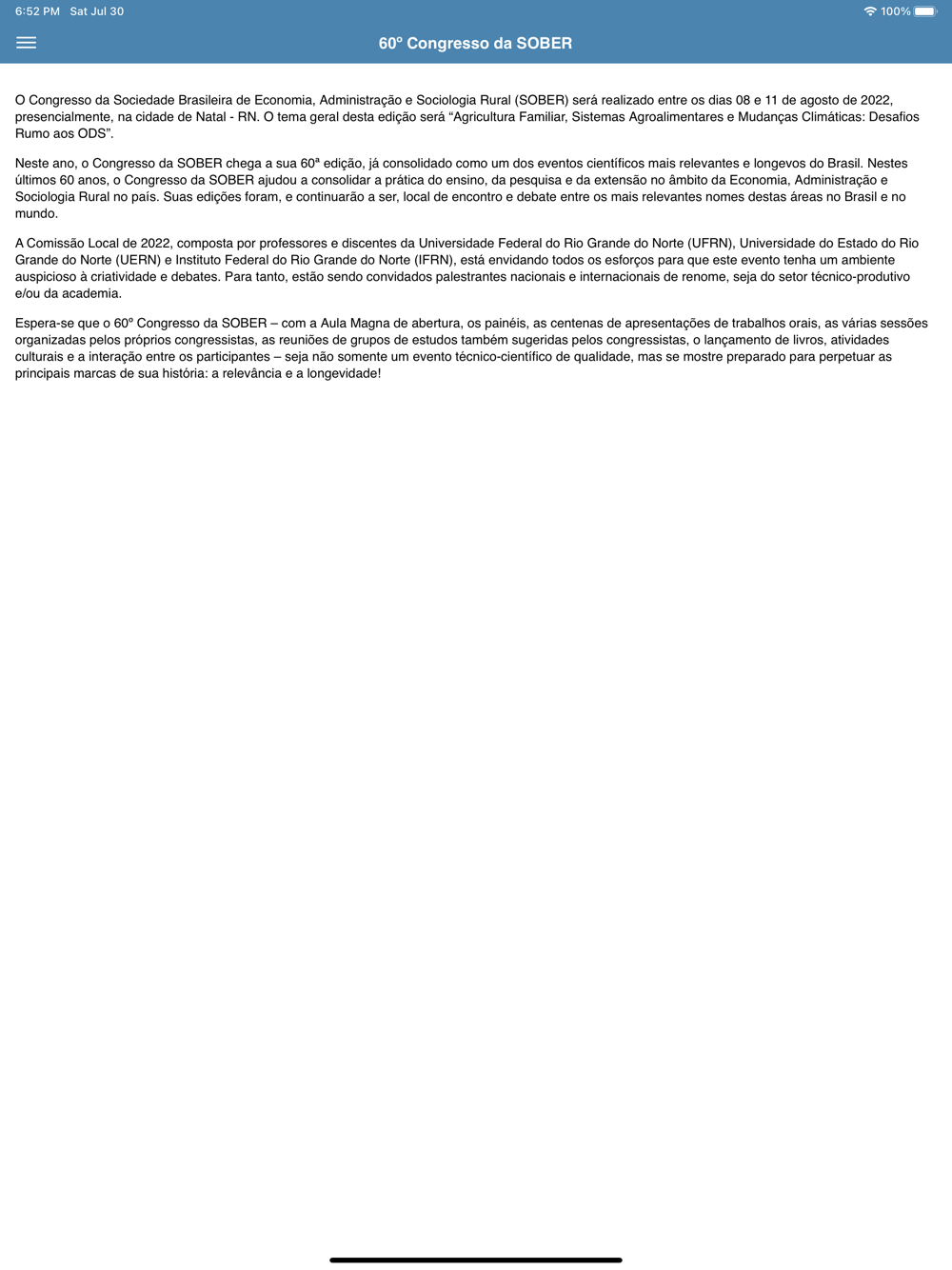 Este é o Aplicativo Oficial do 60º Congresso da Sociedade Brasileira de Economia, Administração e Sociologia Rural - SOBER! Neste ano, o Congresso da SOBER tem como tema “Agricultura Familiar, Sistemas Agroalimentares e Mudanças Climáticas: Desafios Rumo aos ODS”. Em sua 60ª Edição, o Congresso da SOBER já se consolidou como um dos mais relevantes e influentes eventos científicos do País. Esperamos que seja muito proveitoso a todas e todos os presentes!