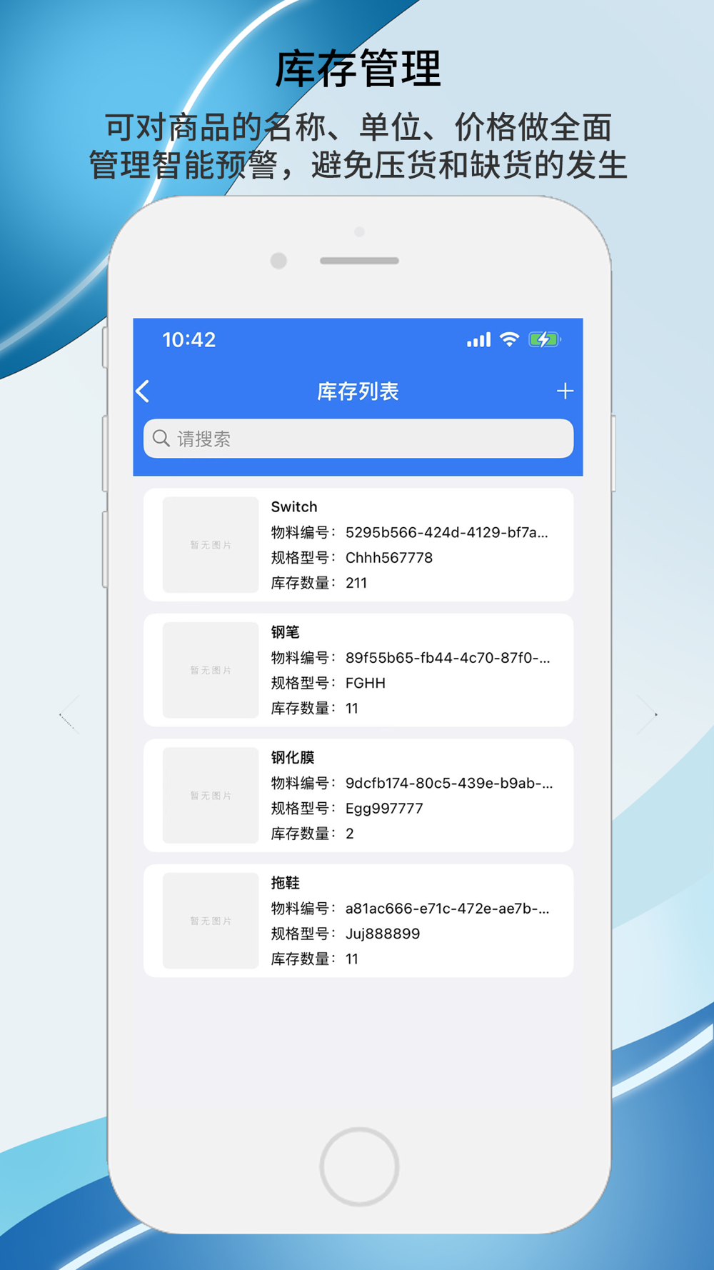 3、库存管理,可对商品的名称、单位、价格做全面管理;智能库存预警,避免压货和缺货的发生。