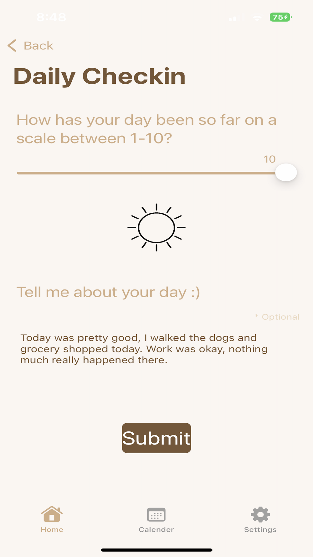 Due to the 2020 pandemic, it is said that the majority of people today have had a decline in their mental health; we all have lost valuable time. This app is meant to keep track of your days and remember everything that happened within them, while also seeing your own progress! With these simple plans, daily check ins, and ratings it will make a great difference in how we go Day-By-Day.