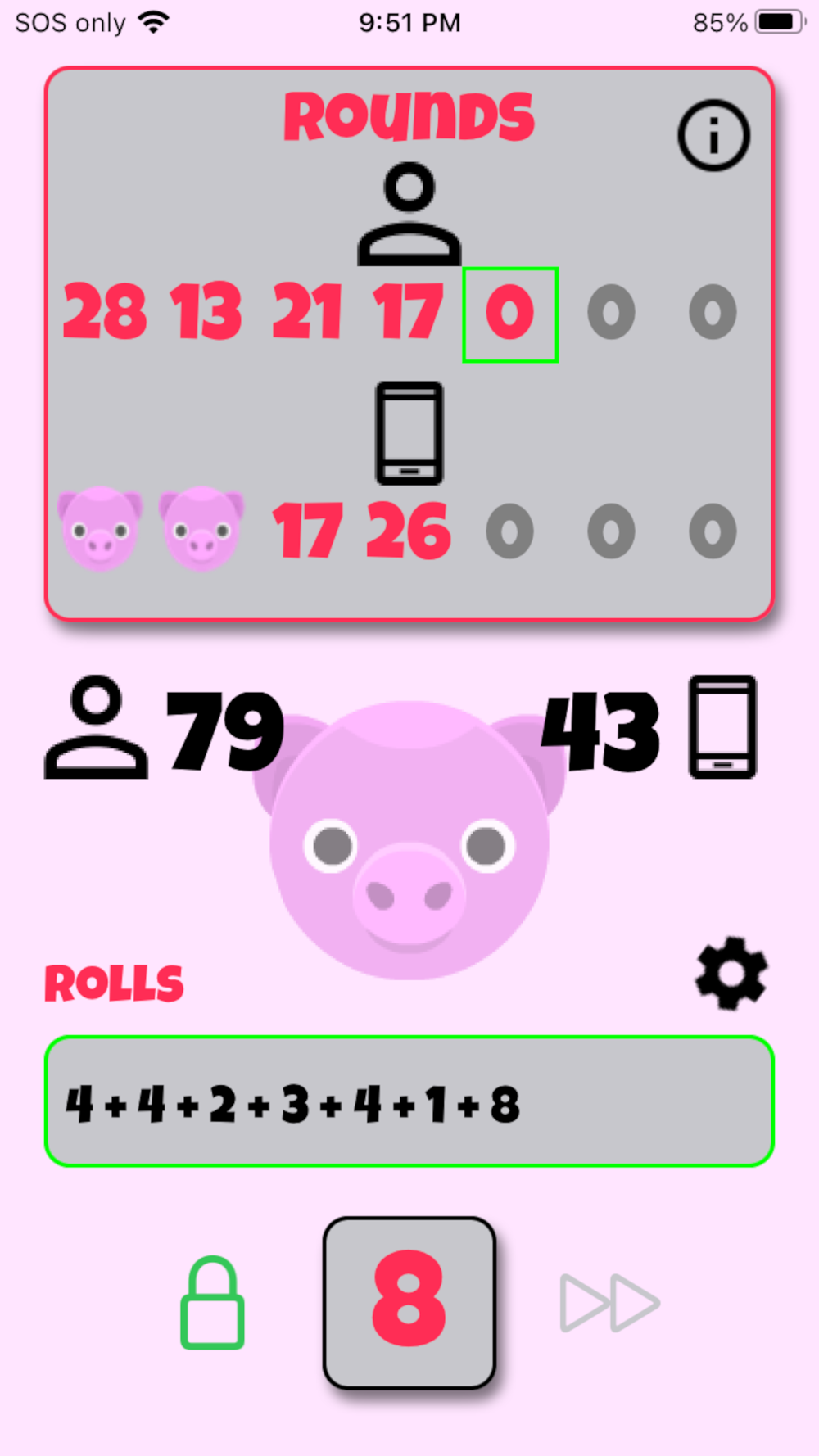 Play against your device over a 7 round tournament. Use each round to build your total score - but be careful, if you roll a 0 you're a greedy pig & you score nothing for that round. Choose a strategy to score big - it's not easy to beat your device!