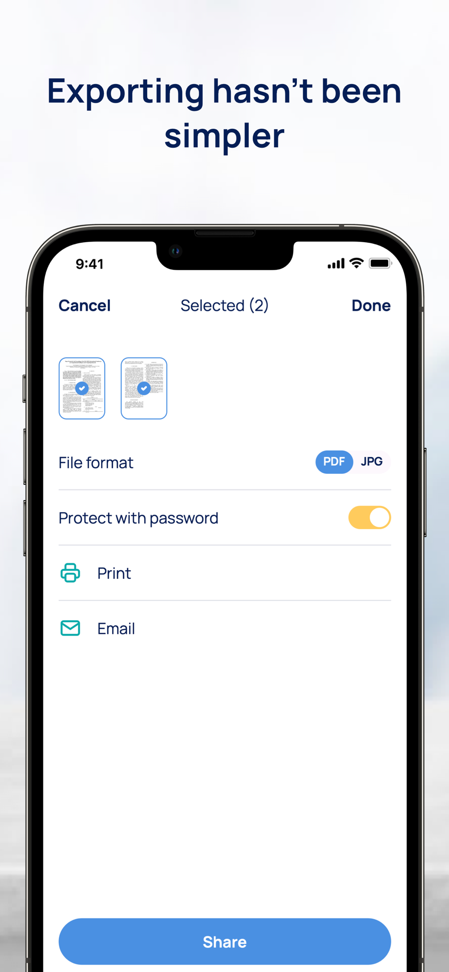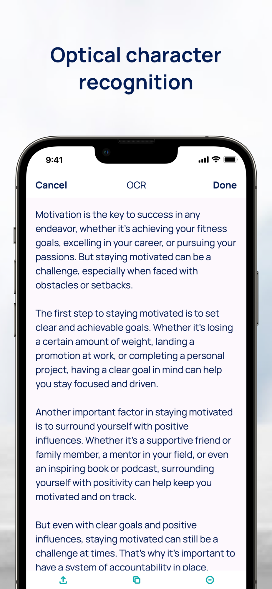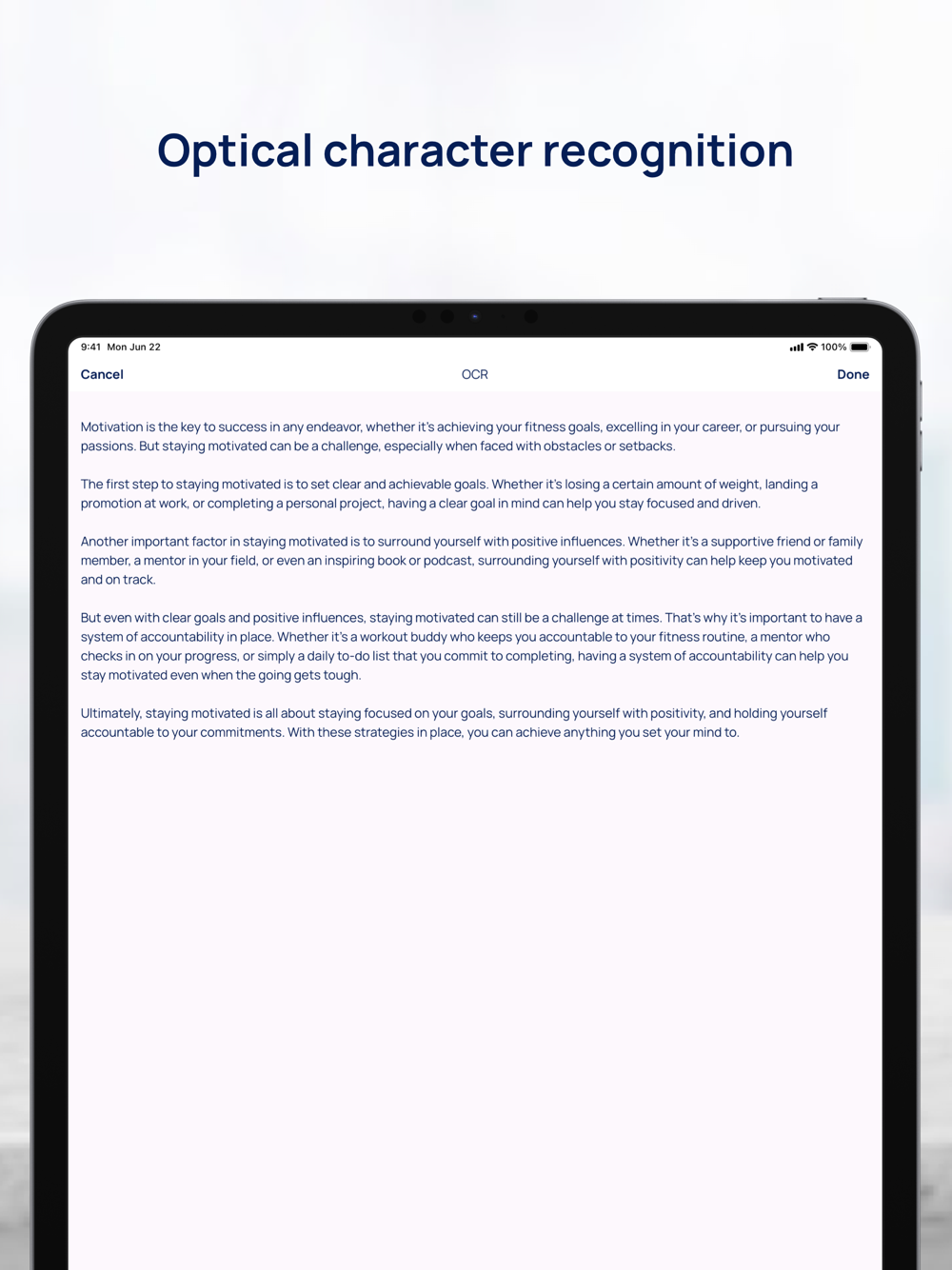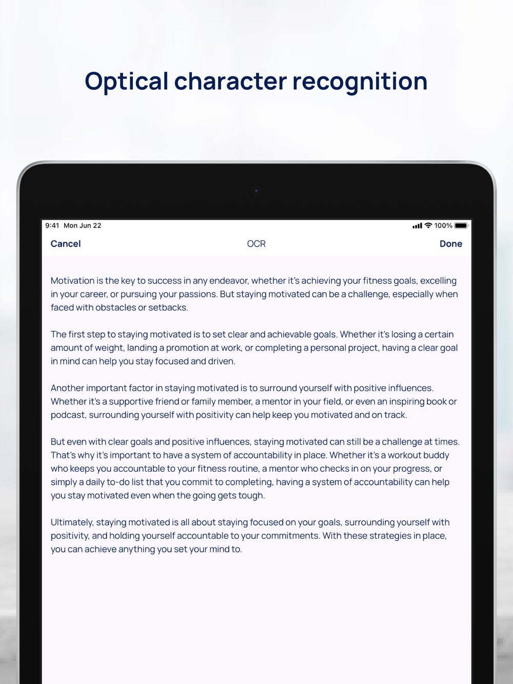With the OCR feature, we can extract text from an image when you scan the document with your camera. You can save the scanned files as JPEG or PDF and share them easily.