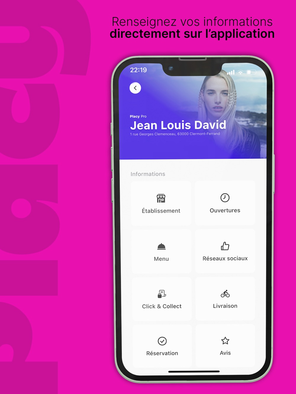 Avec notre application, soyez présent en ligne en un clin d'œil ! C’est très simple ! En renseignant les informations essentielles de votre établissement sur notre application, vous créez vous-même votre micro-site web consultable par le monde entier. Véritable compagnon numérique, PLACY PRO a été développé avec et pour des entrepreneurs qui ont du mal à organiser et développer leur visibilité sur internet. Le coupable principal ? Le temps !