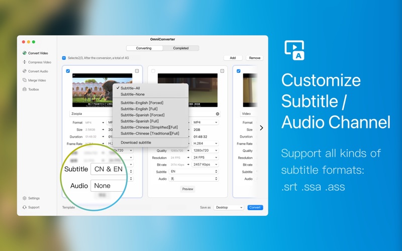 Fast video merging support merging multiple video files. Even if the original formats are different, they can be perfectly combined into a new file.