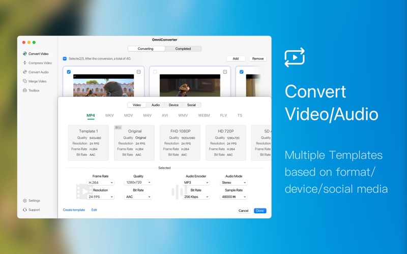 Support templates for Mac, iPhone, iPod, Android, Windows, TV and other devices in specified formats.