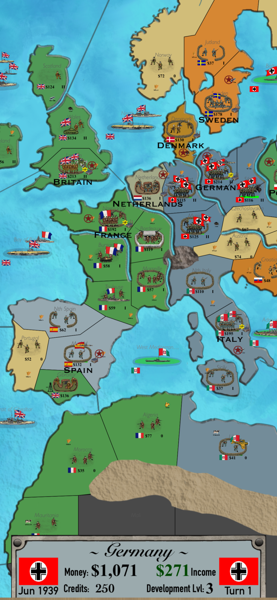 World at War (WW2) is a turn-based game pitting the various major and minor powers against each other. This war game is based on the WW2 conflict and plays through scenarios that increase in difficulty and complexity. Use your land, air and sea forces to spread and dominate the world. As one of the major powers, you can recruit minor countries or conquer any country standing in your way to victory.