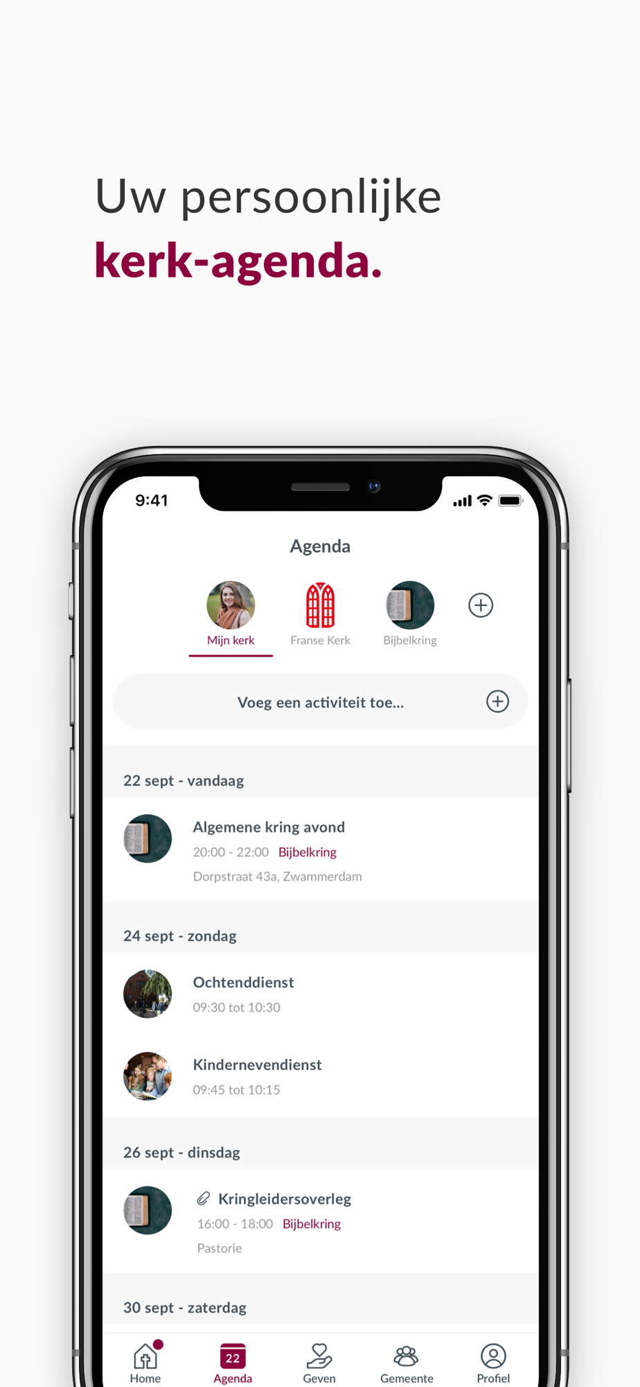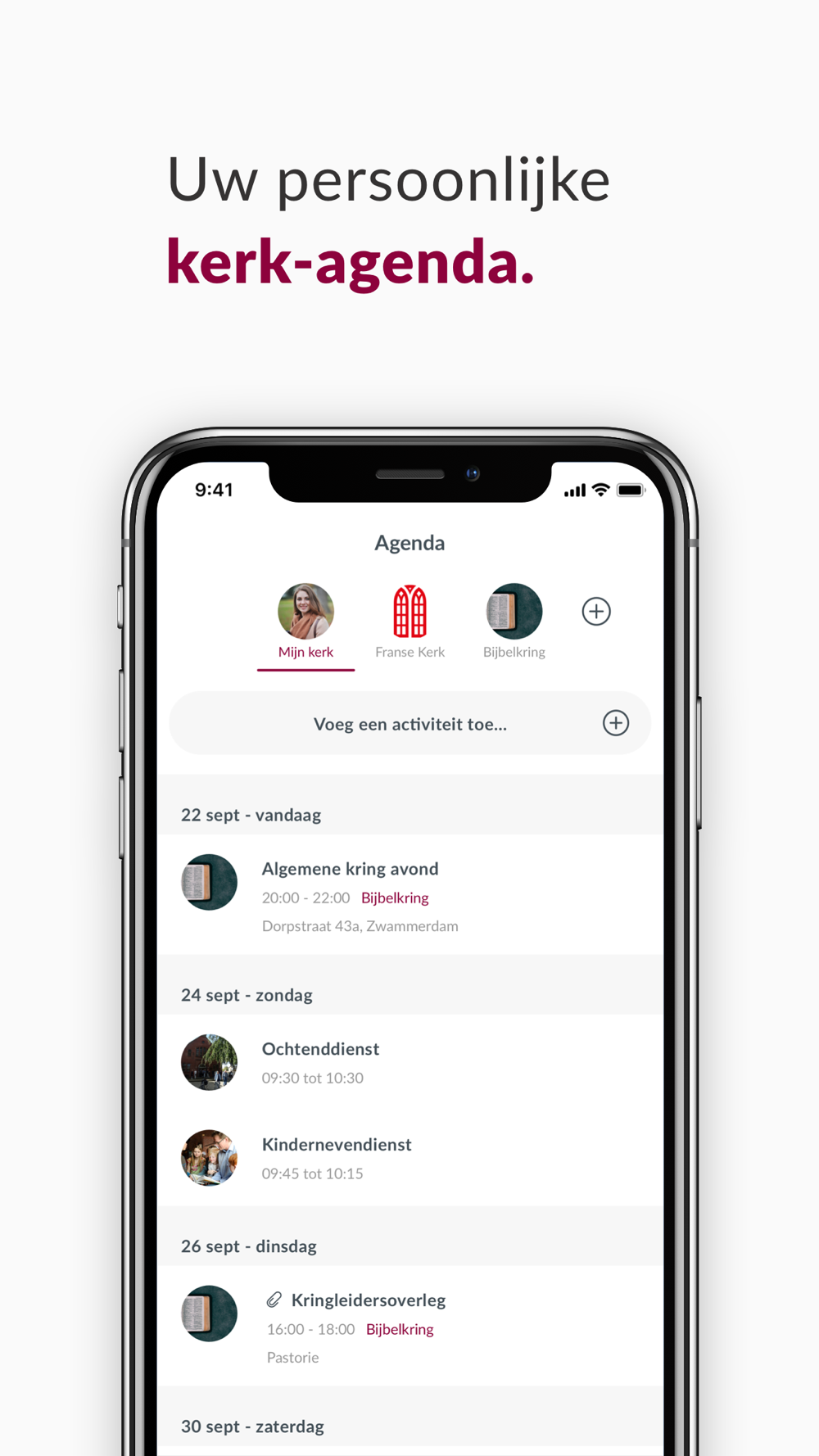 View the calendar for your entire community, but also for specific groups. Thanks to the smart group structure, each user has his own unique church calendar. Then link it to your own personal calendar and don't miss a thing!