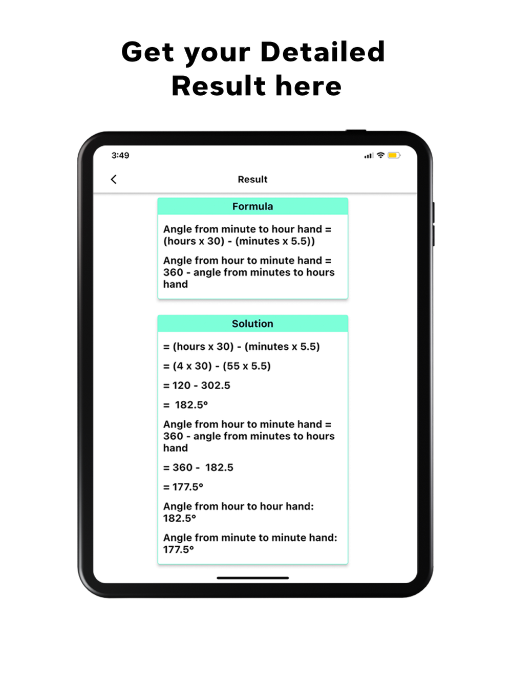 It is a very easy and simple-to-use calculator. This tool enables you to find the angle from minutes to hour hand and hour to minute hand in a single tap.