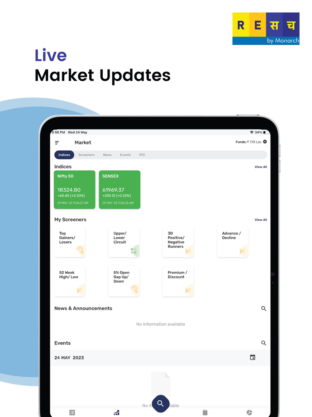 RESACH by Monarch provides you with a single solution for all your trading needs. The app allows you to trade in equities, derivatives (futures and options), commodities, and currencies, and also provides you with a single window of access to invest in IPOs, mutual funds, and global stocks.