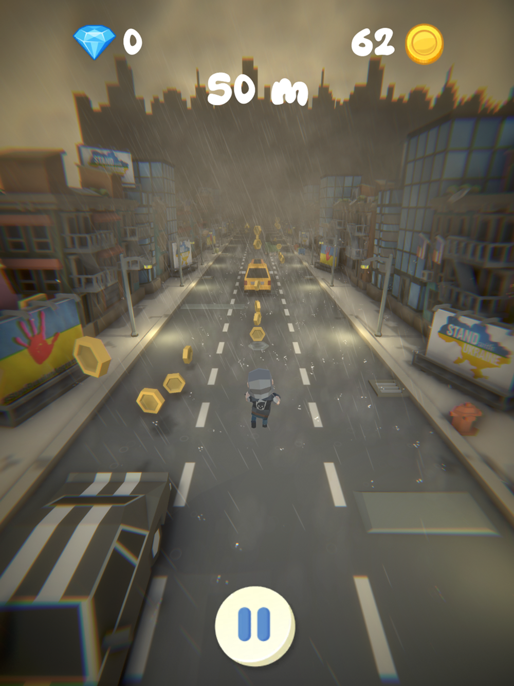 Simple and colorful game. Try to run as far as possible and get on the leaderboard. Collect coins to unlock new locations and new characters!