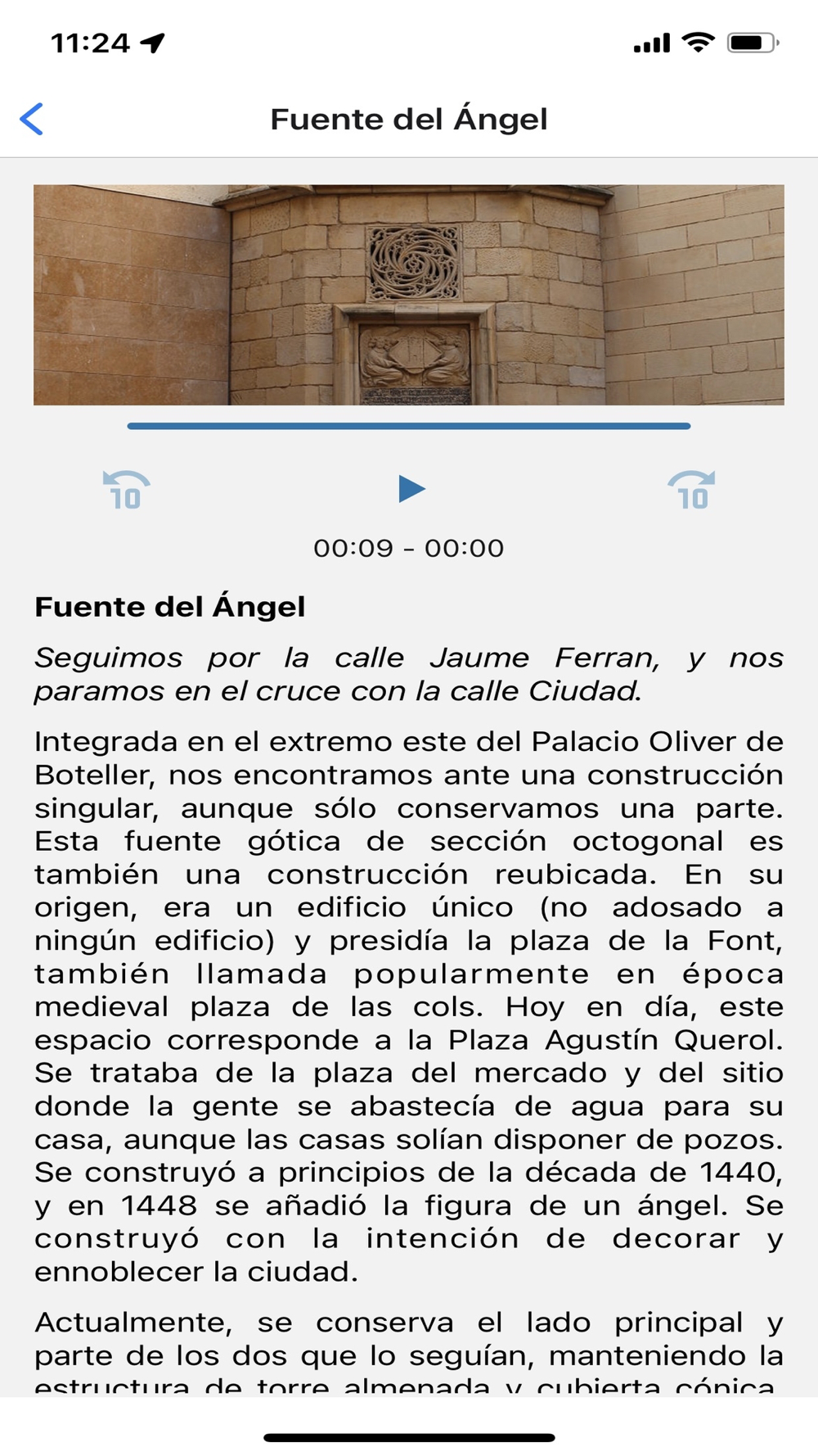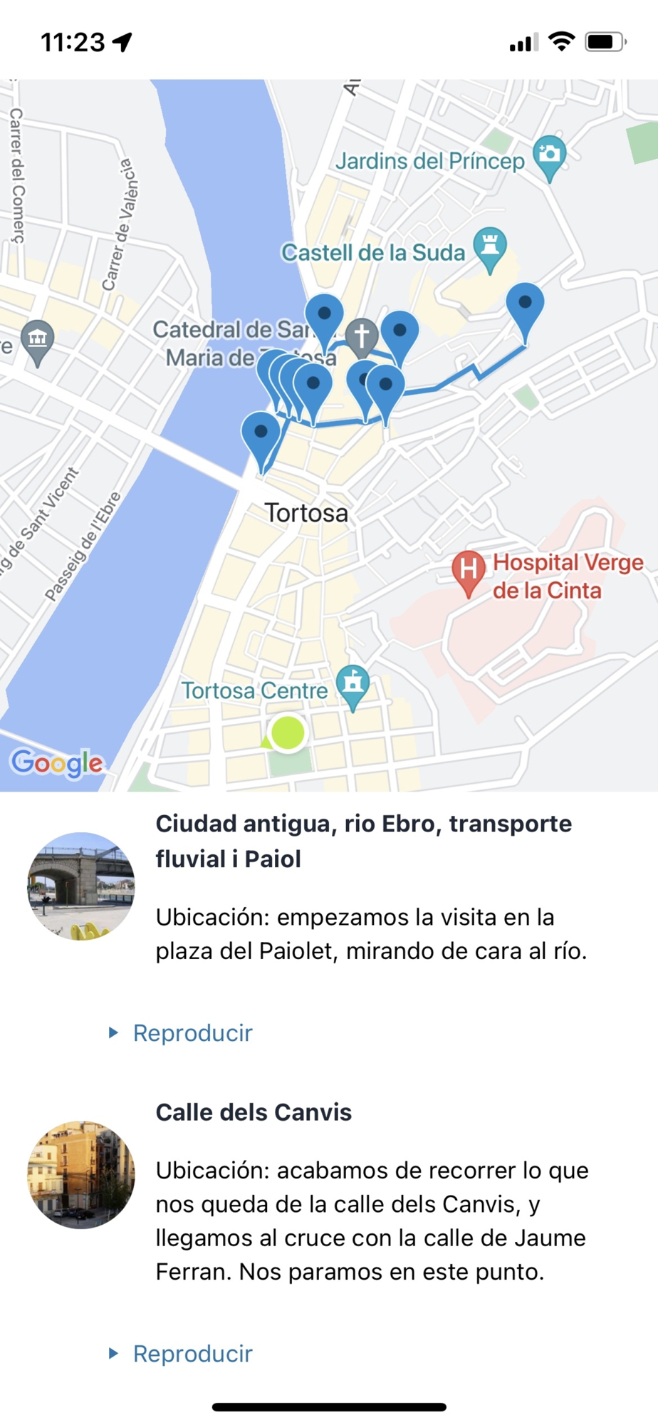 Conficon Turisme audio guide application for the towns of the Terres de l'Ebre. Users can buy an audio guide, and then make the visit on their own without any type of tour guide. They will see the route to follow on the map, and they will listen to the audio with the explanation and they will be able to see additional images and videos. It also includes the text of the audio to be able to follow better.