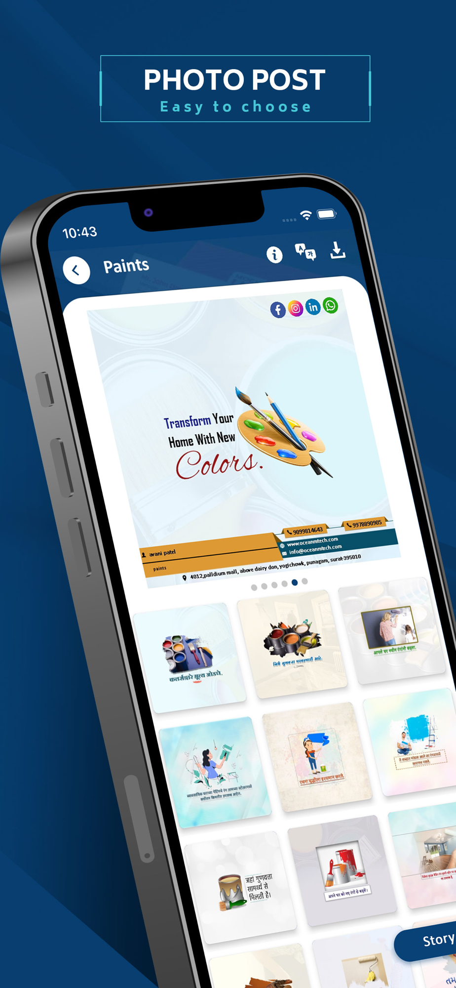 Create Festival Post, 365 Days Post, latest & Trending Events, And Even Your Advertise Posters, Banners, Creatives post, Daily Greetings Post, Appreciate Post, Business Post, Social Media Post, and More For Your Brand In One Click.