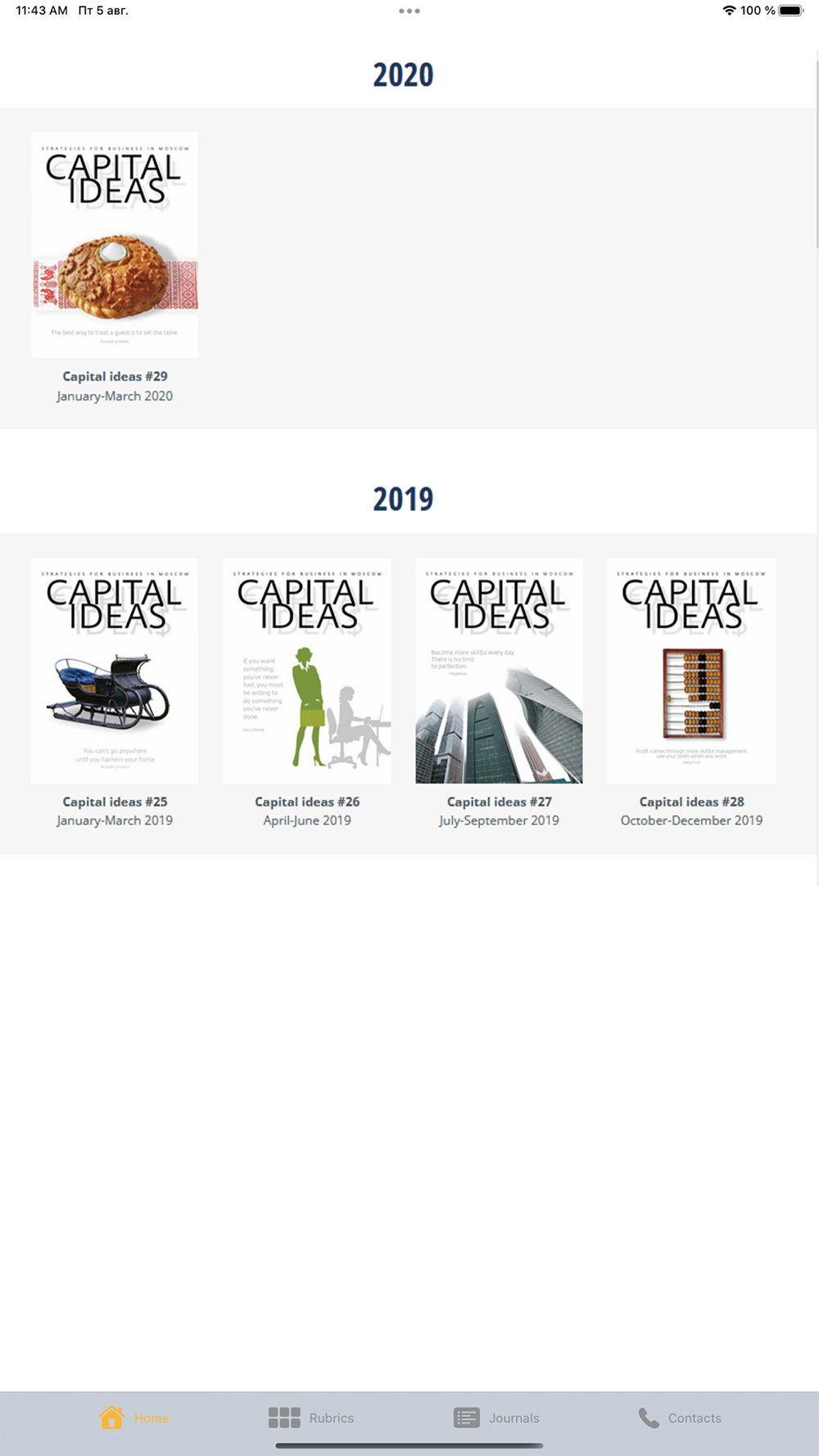 All the materials – items, articles, and interviews feature impartiality, precision, and reasonableness. The power of CAPITAL IDEAS – analytics, serious analyses of everything what is going on with in the Moscow’s business climate. The journal shows how life in Moscow and Russia is changing, offers concrete recommendations regarding the spheres of investing.