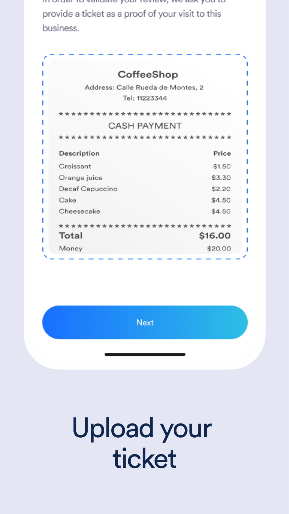 We are looking for real & trustworthy people. Share with other users your real purchase experience in your favorite store or establishment, and help building a world without fake reviews. Only real claims from real people.