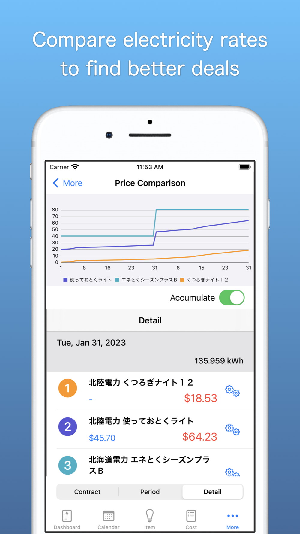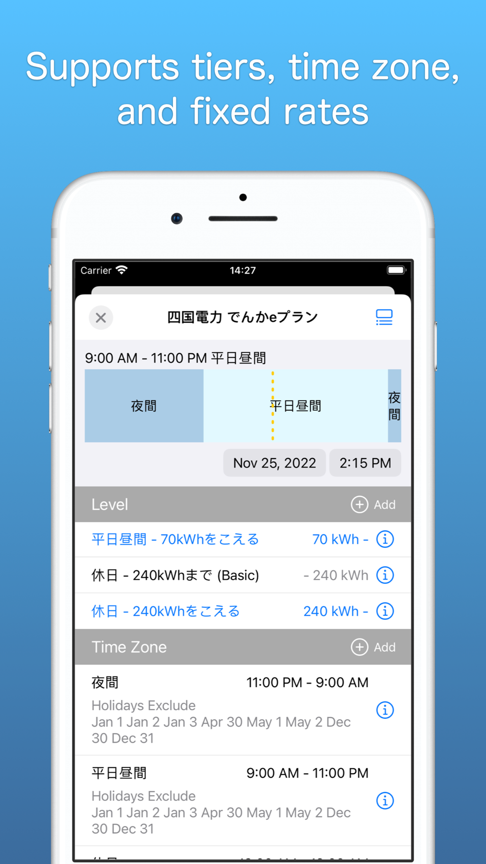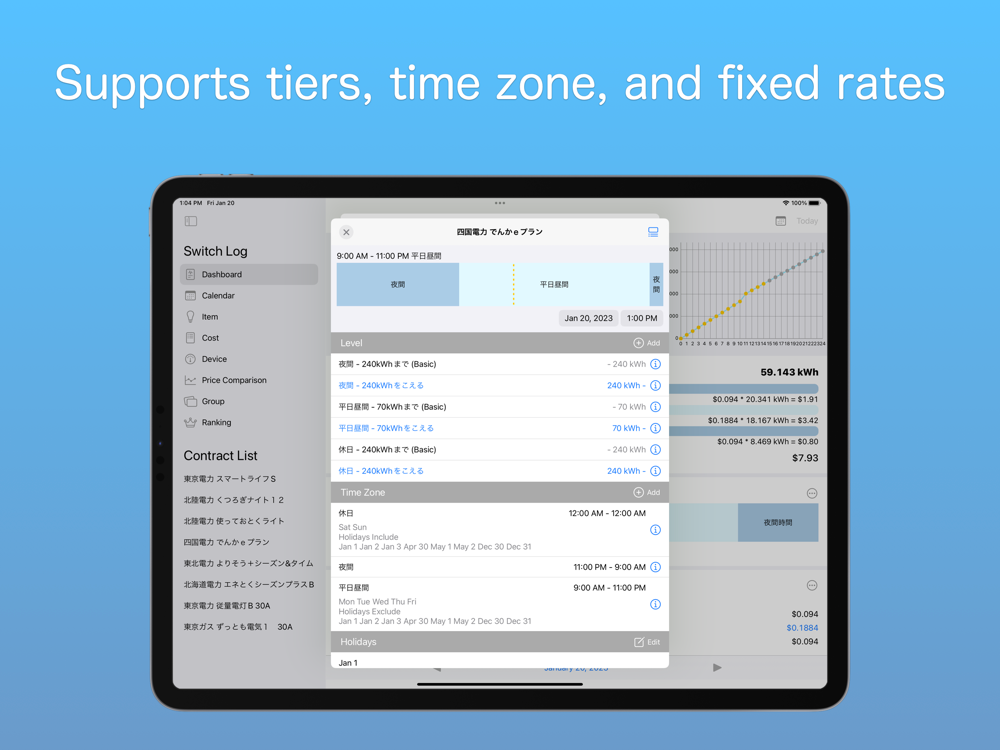 - Calculate electricity charges by tier (metered rate), by time zone, and flat rate.