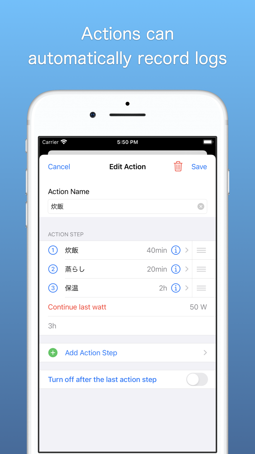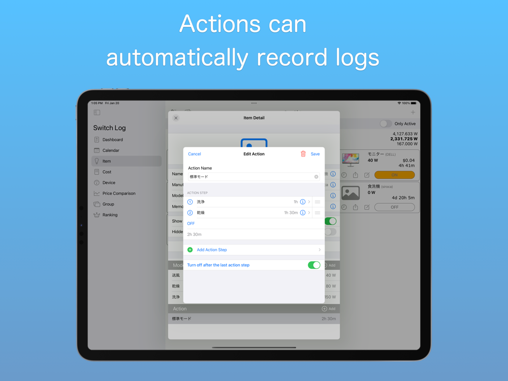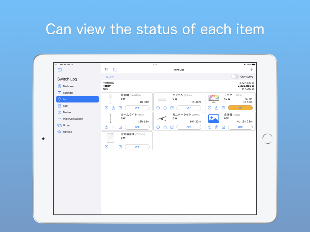 - Register items (household appliances and power consumption items) and record ON/OFF for each item (log).
