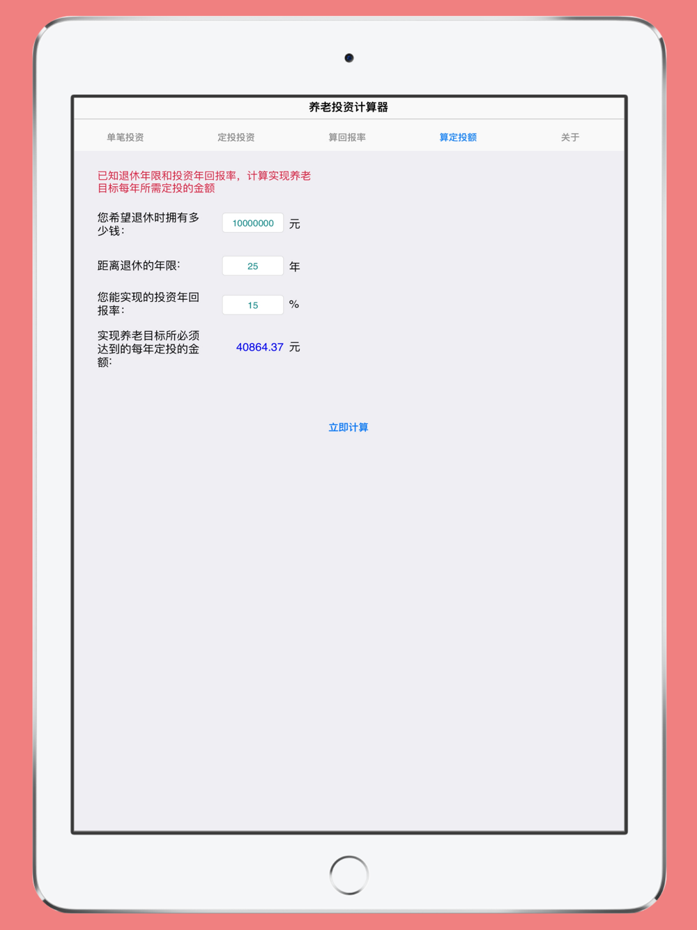 4. 已知退休年限和投资年回报率,计算实现养老目标每年所需定投的金额。