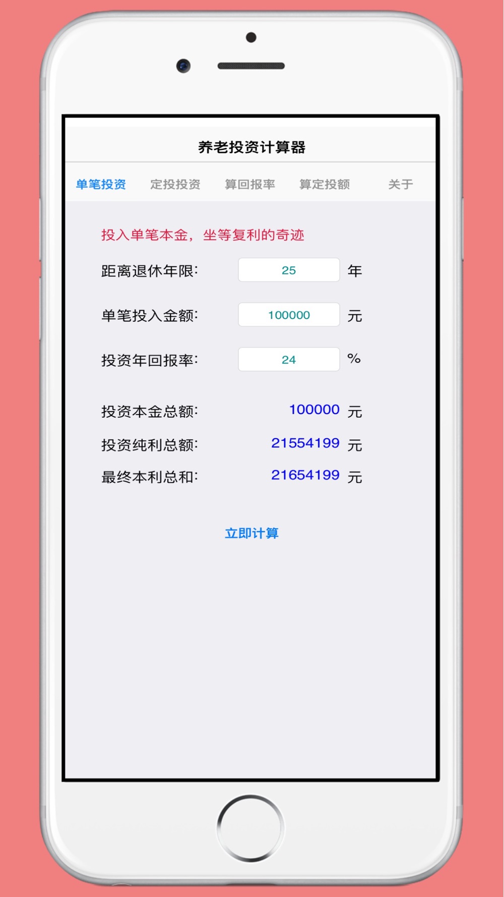 1. 投入单笔本金,计算退休时的复利收益;