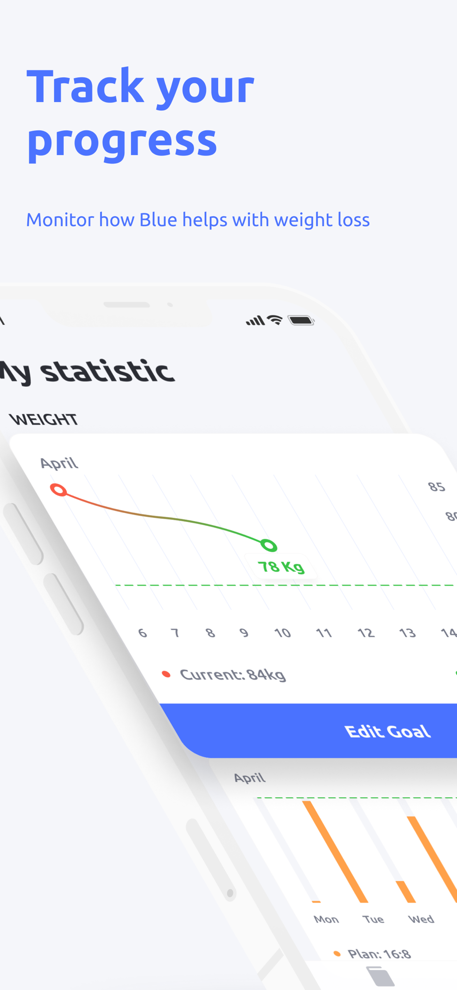 Blue will accompany you day after day on the way to your goals. Reach your desired weight, recover and feel full of energy. Blue Color, which accompanies you on all application screens, affects your subconscious mind to make it easier for you to starve.