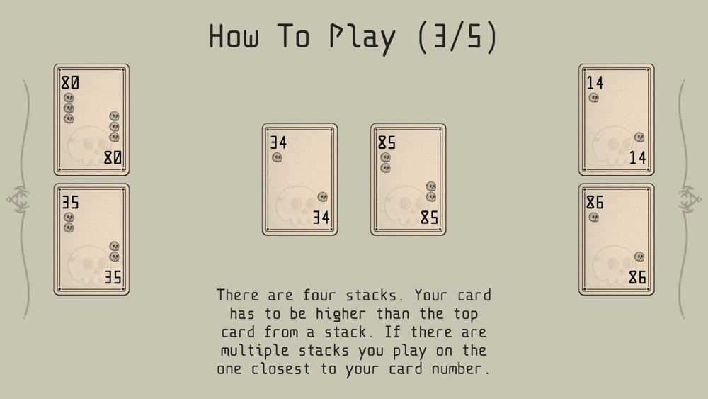 Both you and the AI start with 12 cards. In each round, you both play a card on different stacks collecting penalty points. Whoever has the least amount of penalty points at the end wins. You can play multiple rounds and keep track of your overall score.
