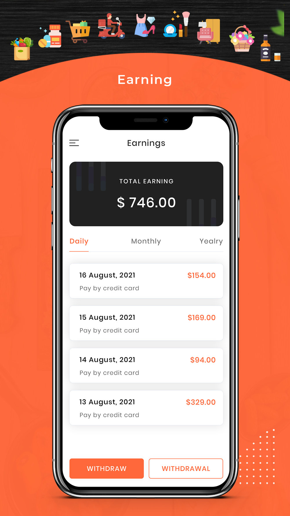 Delivery person can choose their location and deliver products to nearby locations. More earning can be made depending on multiple delivery. Earning withdrawal is easy and secure for delivery person.