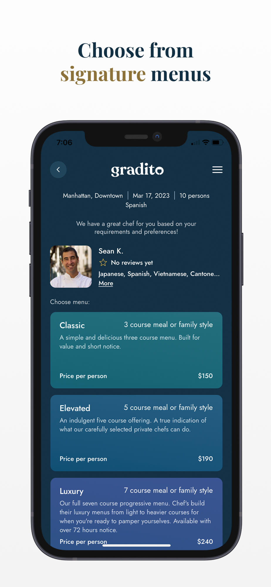 Download our app to connect with trusted private chefs and sommeliers from a variety of styles, instantly. Select preferences and match with a vetted chef without having to make a phone call or wait for a reply to your email. Select preferences and connect with a vetted chef within a day's notice. At Gradito, the most exclusive chefs are ready to serve you and your guests.