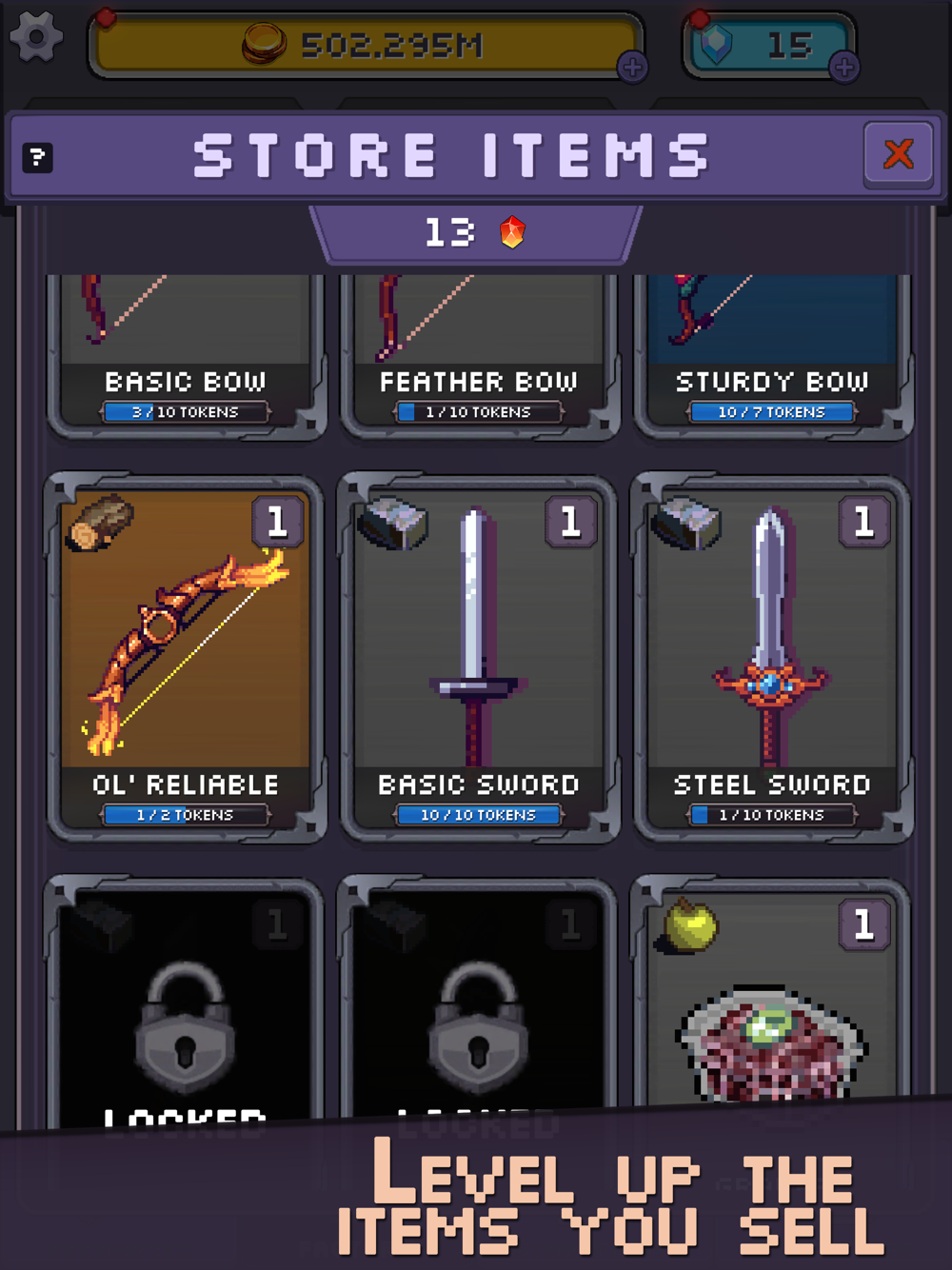 Level up store items: Each item in your store has its own level. Collect store item tokens from completing objectives. Leveling up your store items increases how much of this item you can produce and how many coins you can sell it for.