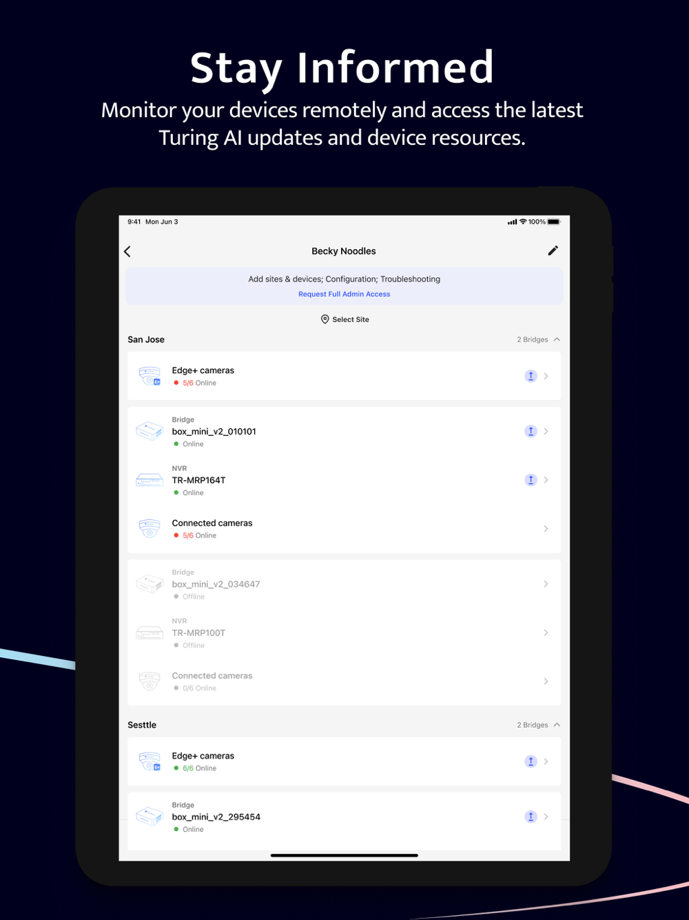 Monitor your devices remotely and access the latest Turing AI updates and device resources.