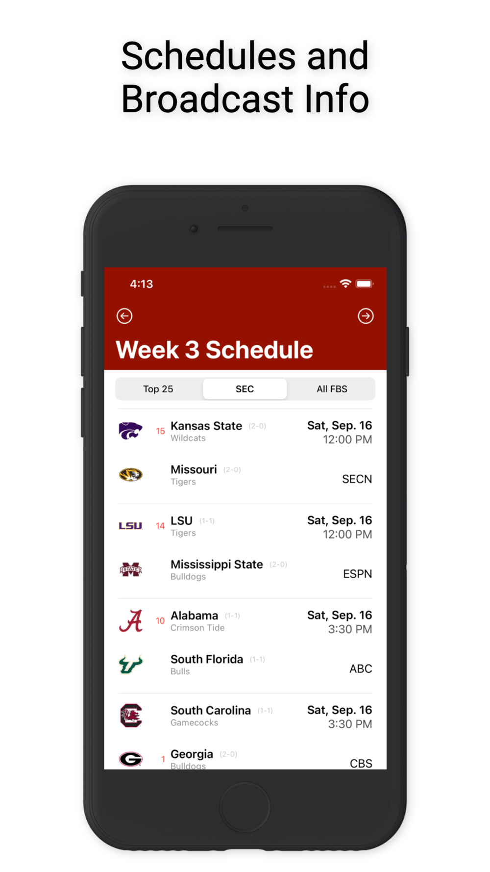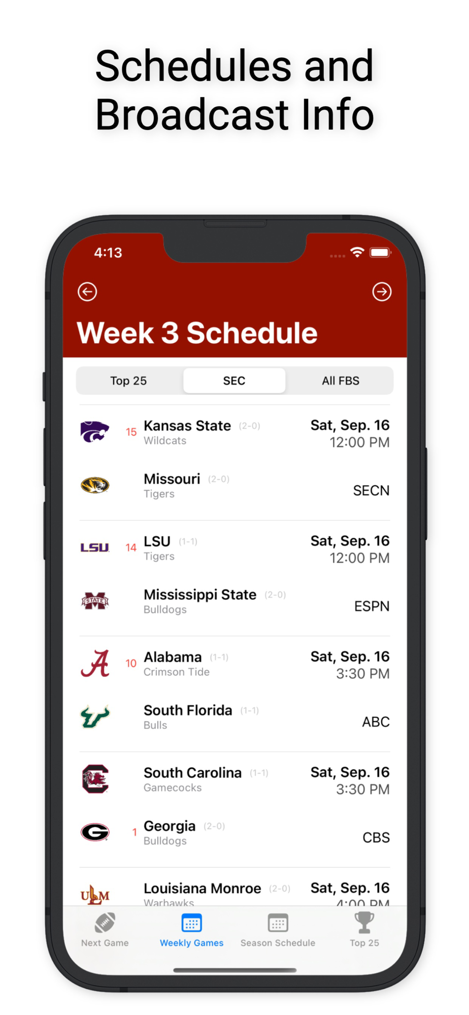 Tired of clicking through endless pages of information to see who is playing this weekend or to view your team's season schedule? College Football 2022 is the one-stop shop for all college football fans to learn about their favorite teams, conferences, and games quickly. You can quickly see upcoming times and television information for your favorite team, conference, or top 25 games each week. With a straightforward click learn more about your team's roster.