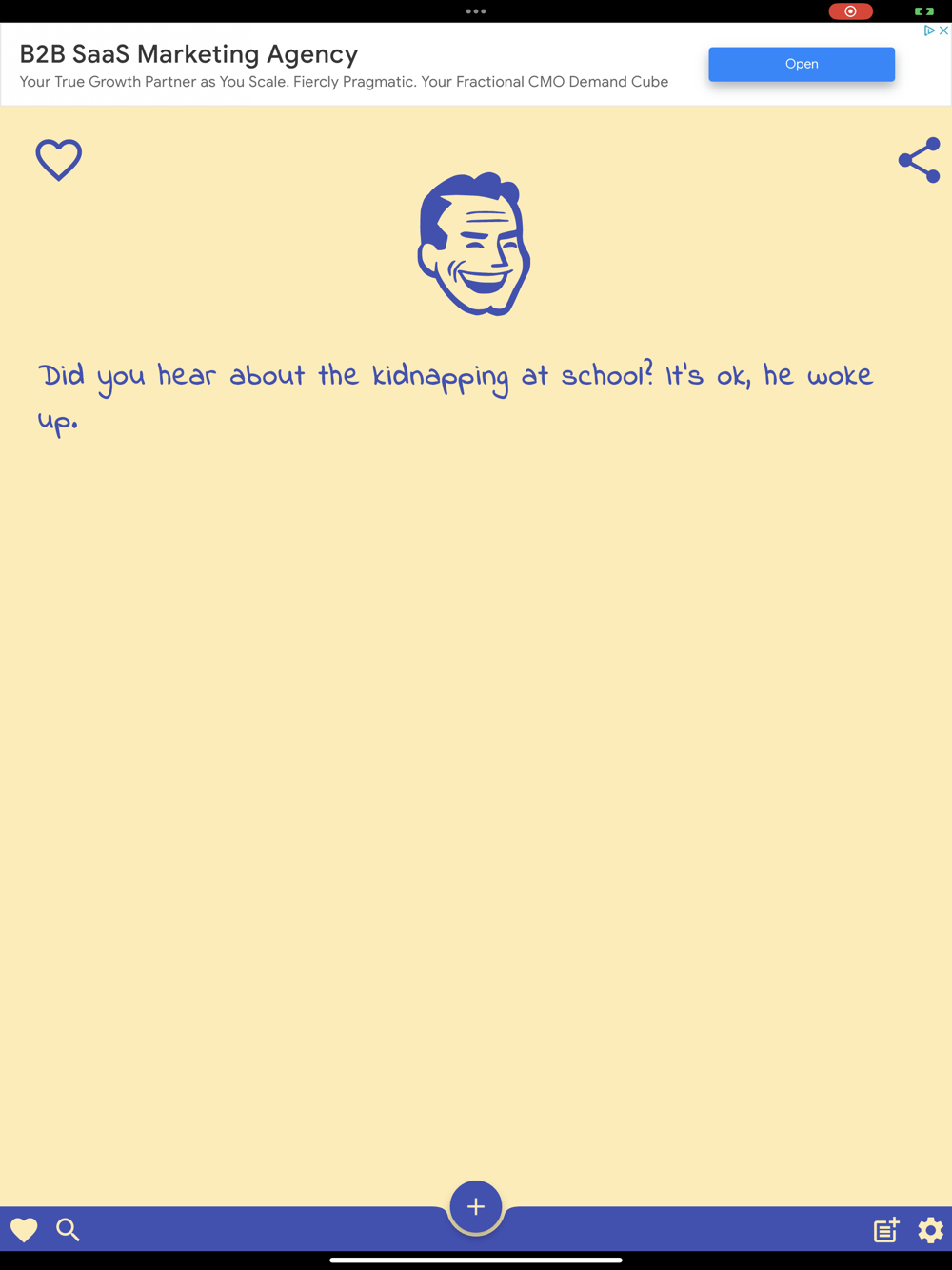 The Dad Jokes Daily app lets you get jokes at the push of a button. You can search for jokes, mark your favourites to refer to them later, share them with your friends, submit your own jokes, and receive a joke notification to your phone each day at a time that suits you.