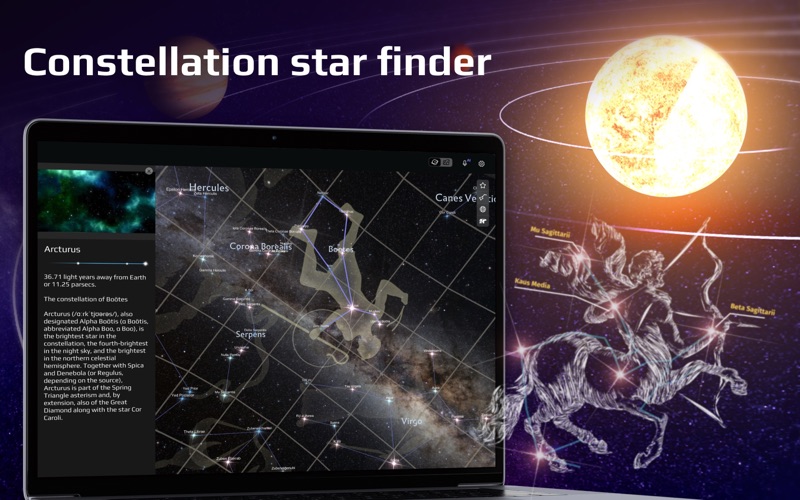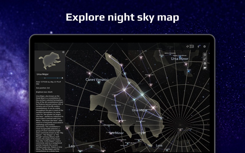 Interactive app Stellar Sky — Planets Map is a unique guide to the night sky with an accurate description of space objects. The AI voice assistant makes it easy to navigate the sky and brings more fun to your journey through the galaxy!