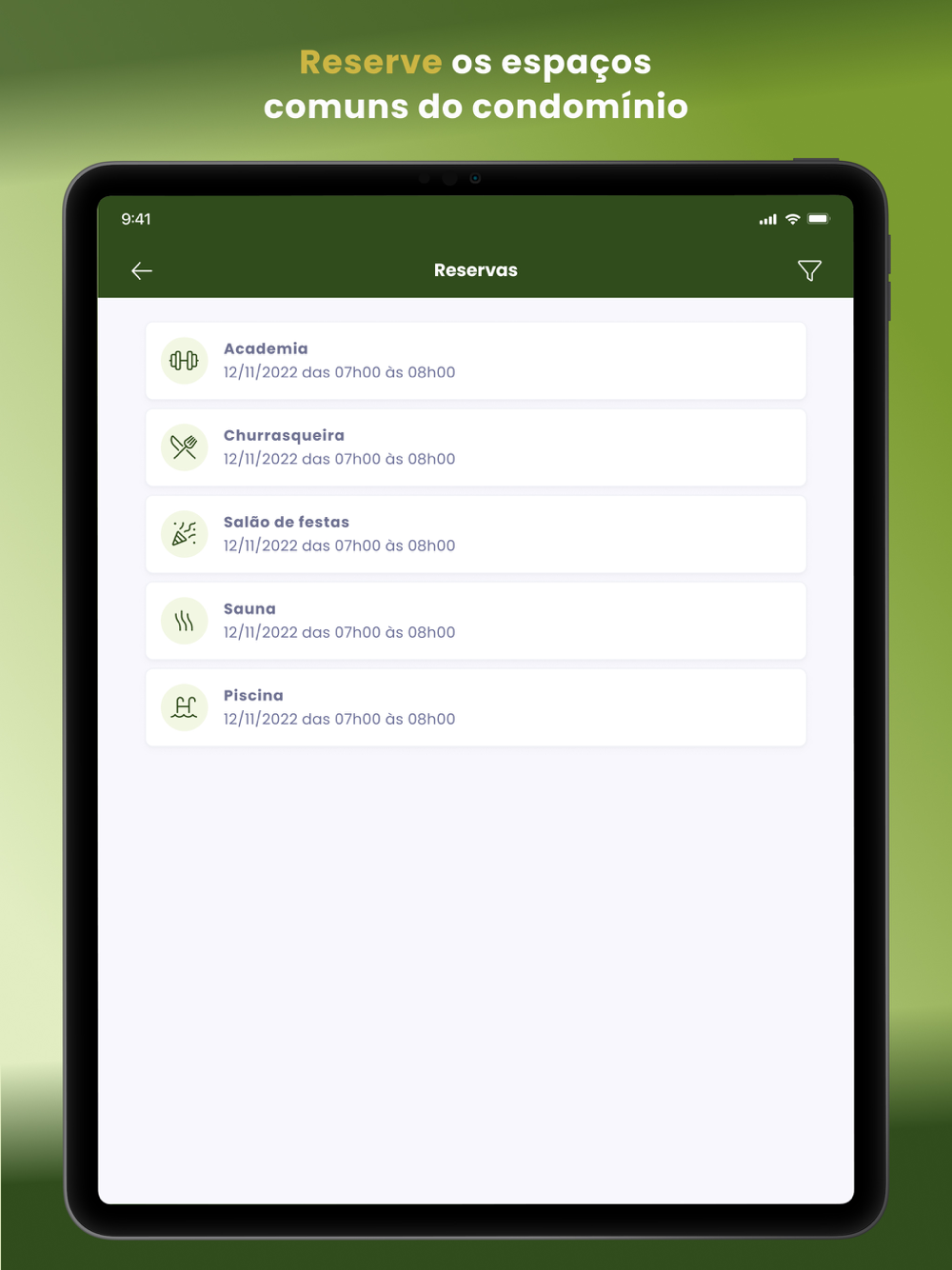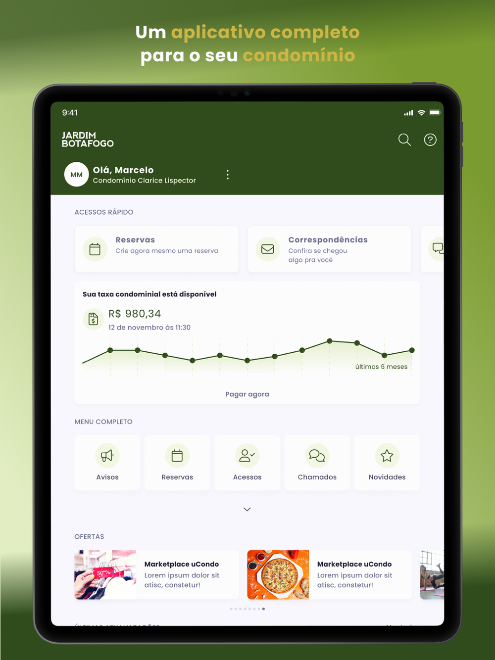 • RESERVAS: Moradores realizam reservas dos espaços comuns (churrasqueiras, salão de festas…) através do app Condomínio Jardim Botafogo. Chega de ligar na portaria ou síndico para consultar a agenda dos espaços.