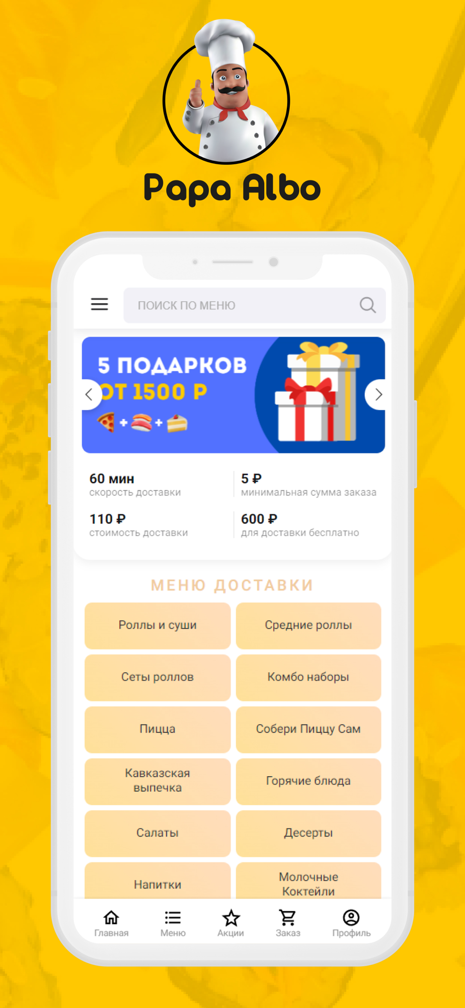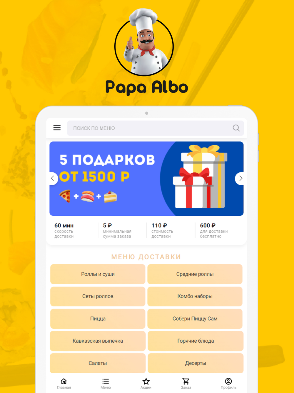 Меня зовут Тигран Альбертович я являюсь шеф поваром и владельцем доставки суши и пиццы Папа Альбо. С 2018 года мы доставляем суши и пиццу, мы всегда работали над качеством и создали уникальный продукт, который с каждым годом набирает все больше и больше популярности, мы взяли за основу качественные продукты, никаких замороженных рыбы, только охлажденный и свежий лосось, мы очень долго прорабатываем продукт, дополняем его, улучшаем что бы достичь лучшего вкуса, так появляются позиции в нашем меню которые обретают популярность среди наших гостей!