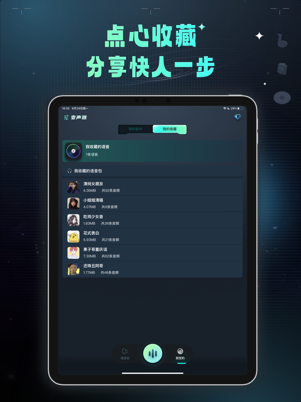 「收藏夹」把喜欢的录音、变声加入收藏夹,支持能够无限制地添加收藏,十分便捷。