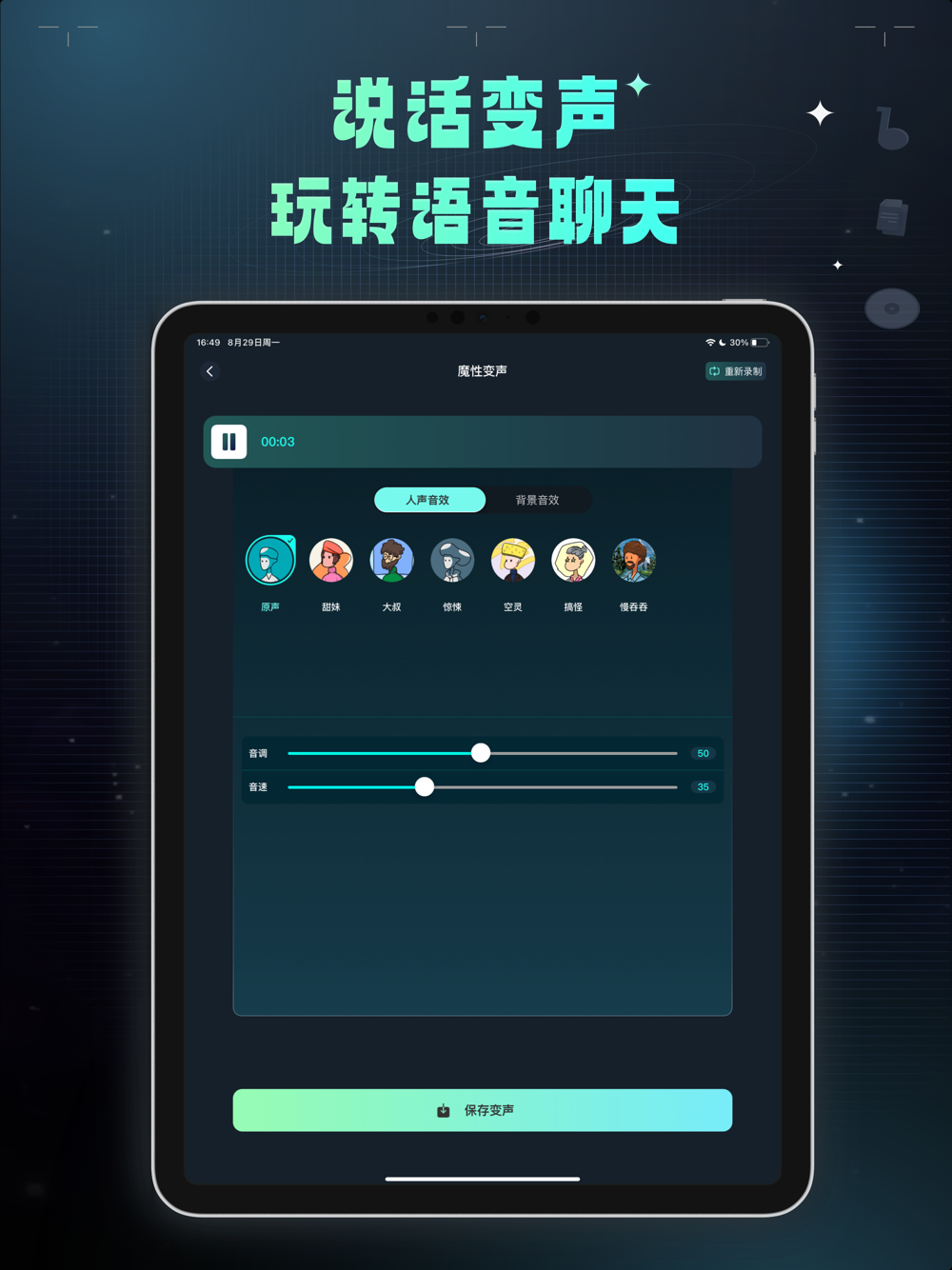 「魔性变声」支持多种变声音效,例如:大叔、萌妹、老人、小孩、正太等等,你要的全都有!